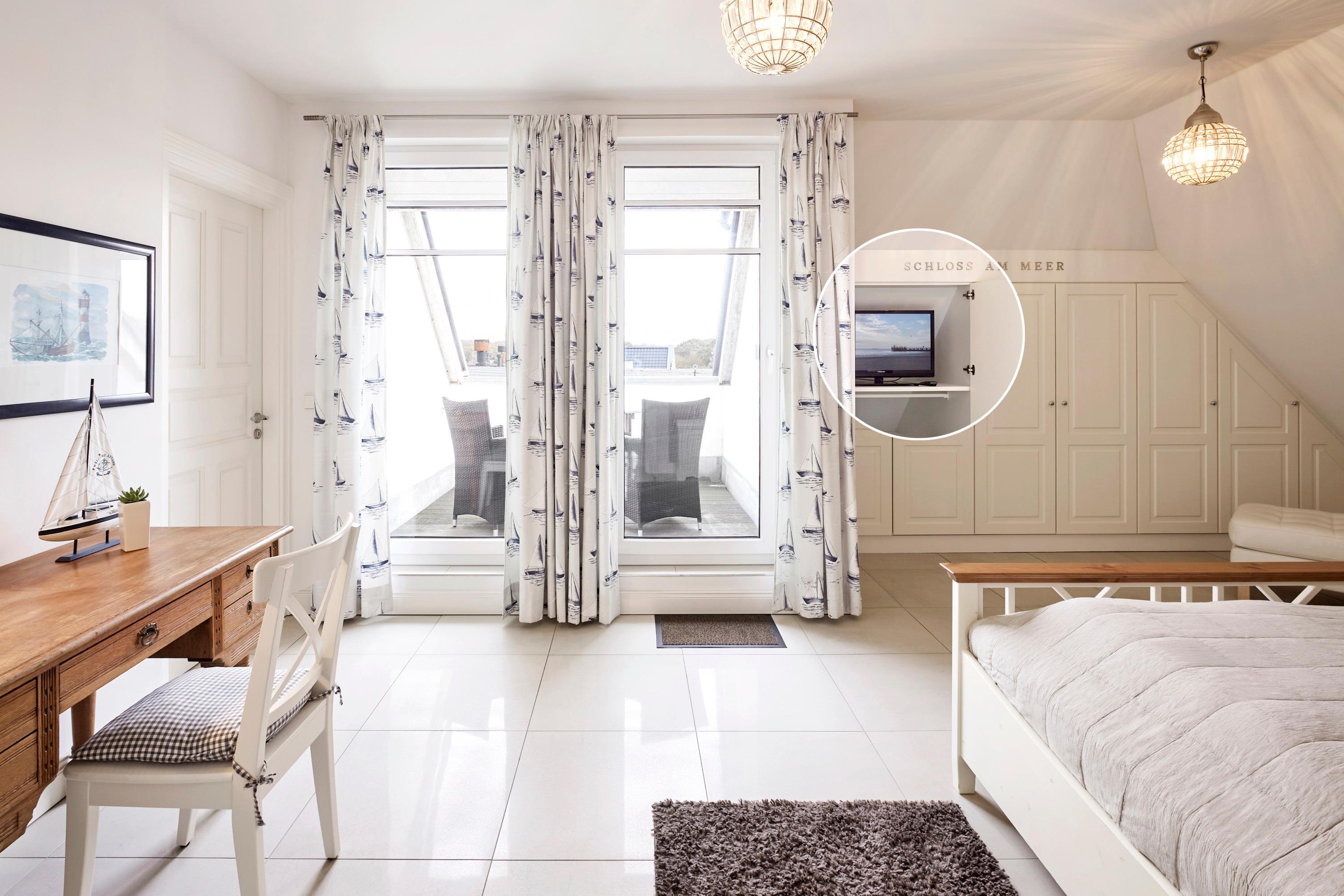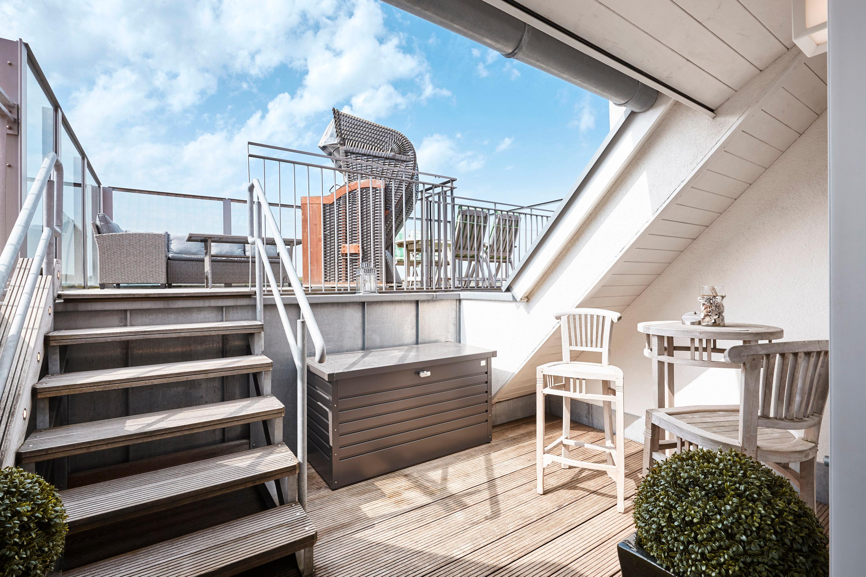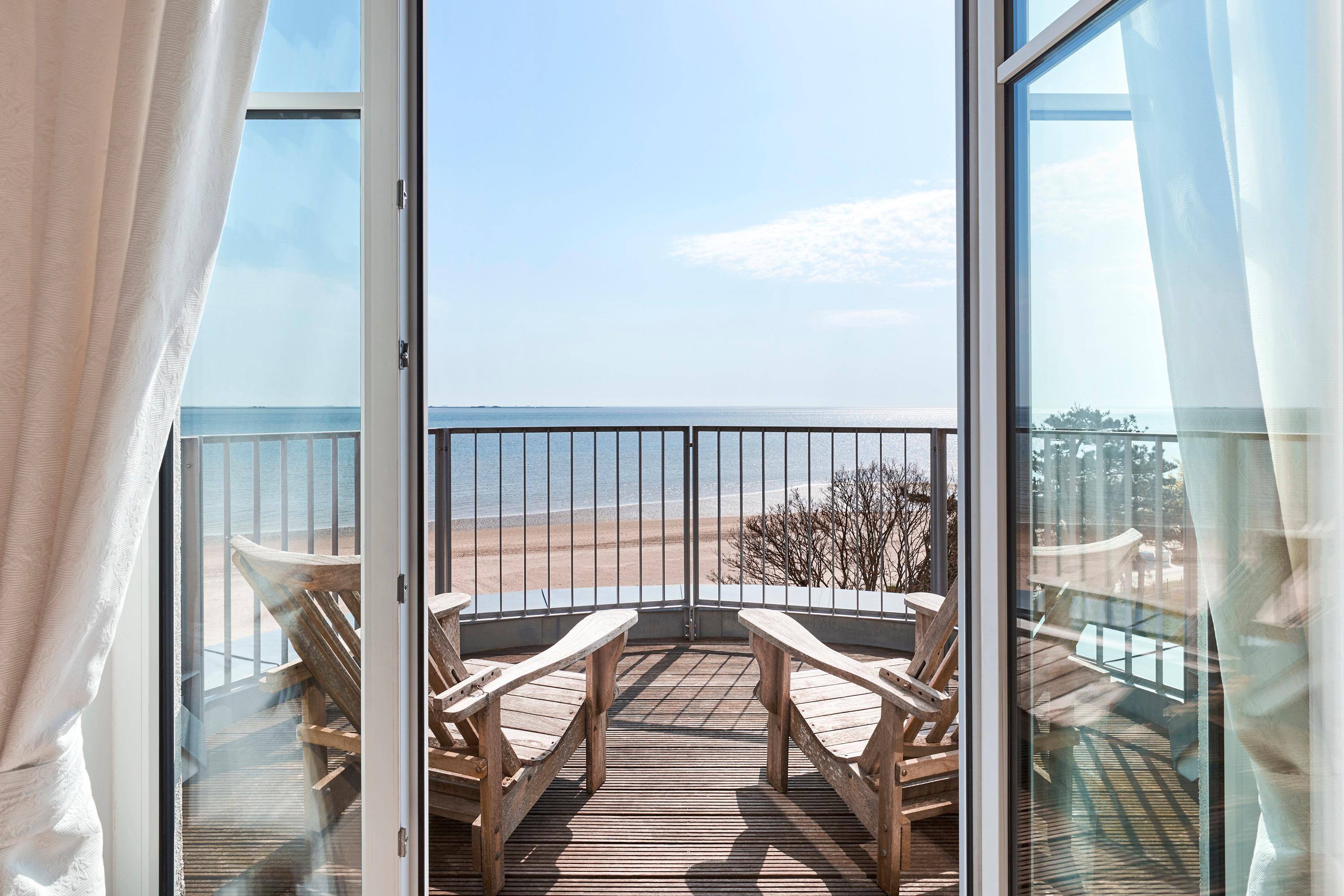 Wir begrüßen Sie im Schloss am Meer, der exklusiven Wohnanlage direkt am Wyker Südstrand. Ihre Penthouse Wohnung liegt im 4. Obergeschoss hinter der historischen Fassade, welche beim Neubau erhalten wurde. Hier laden zwei Dachterrassen und eine Loggia ein, den Blick auf die Nordsee und Halligen zu genießen. Ein einzigartiger Panoramablick erwartet Sie. Genießen Sie die Sonne schon beim Frühstück! In nur wenigen Schritten befinden Sie sich auf der Promenade, die Sie ins Herz von Wyk führt. Hier laden Geschäfte zum Bummeln ein, in Cafés und Restaurants werden Sie mit kulinarischen Köstlichkeiten verwöhnt.