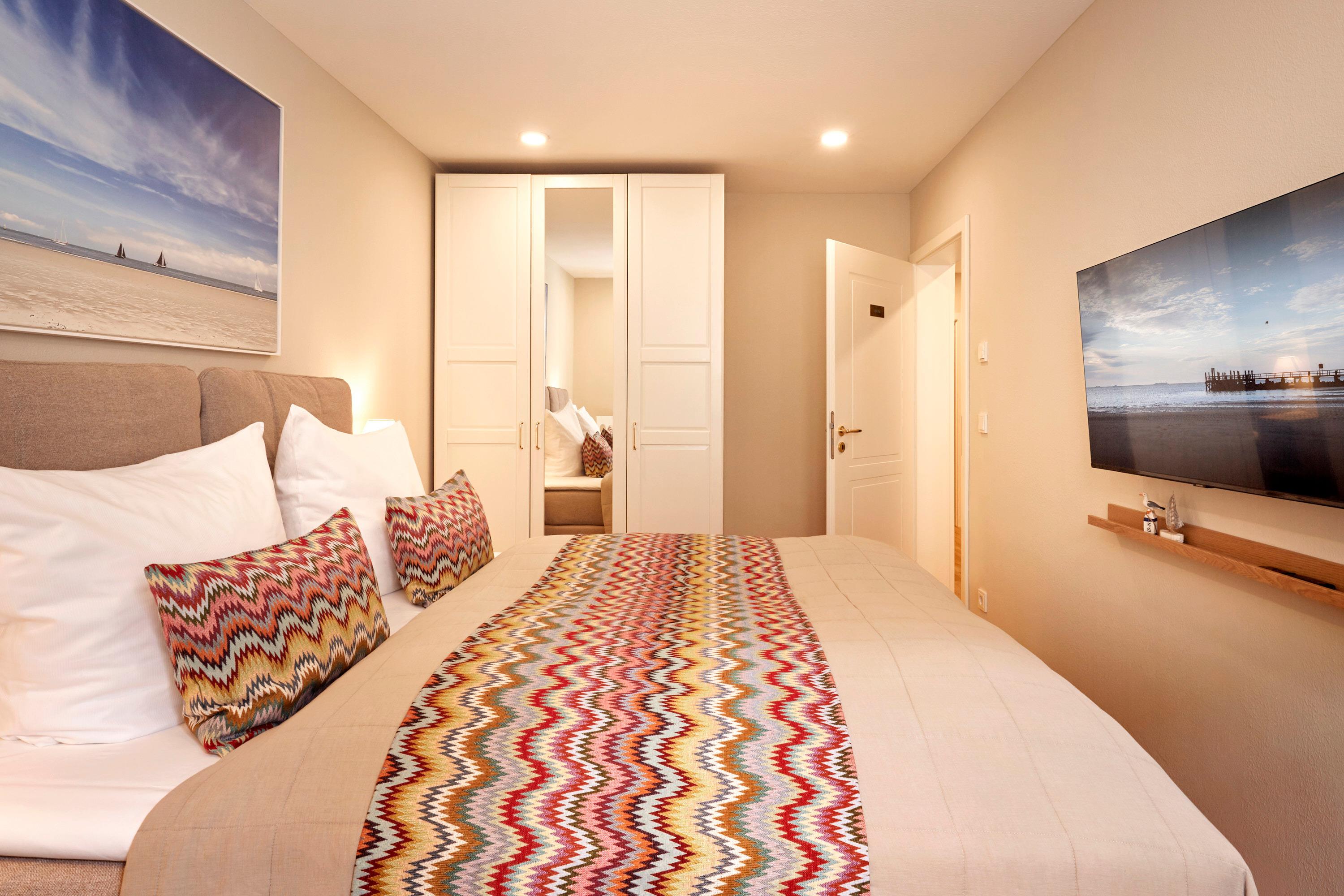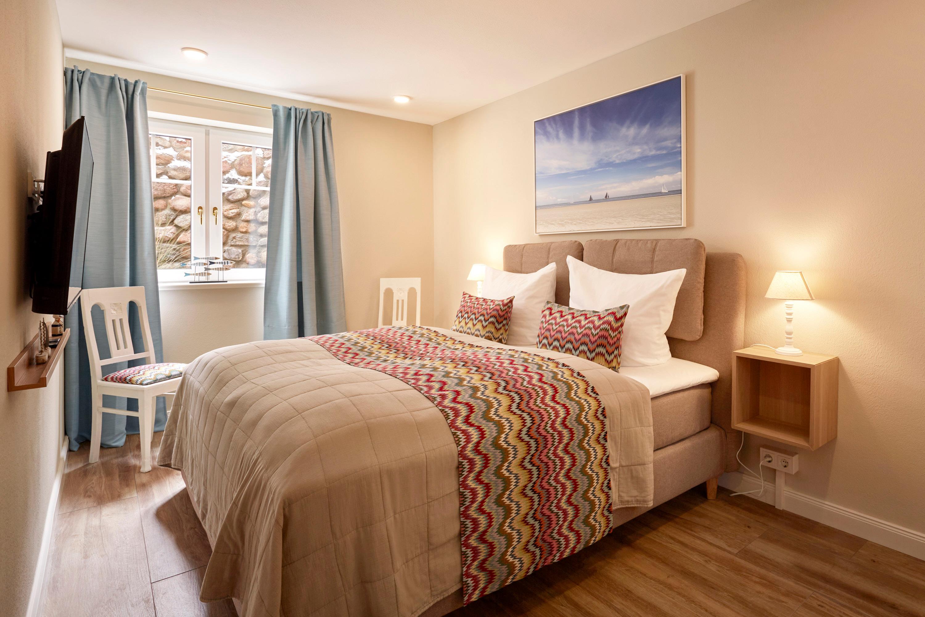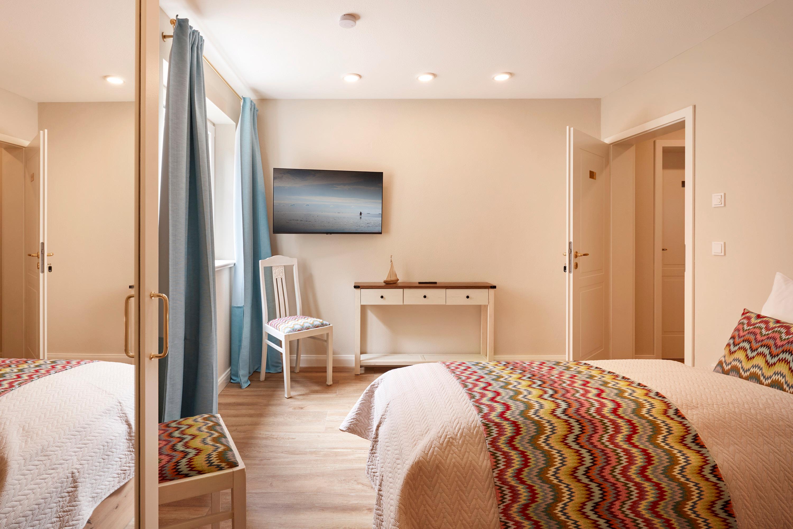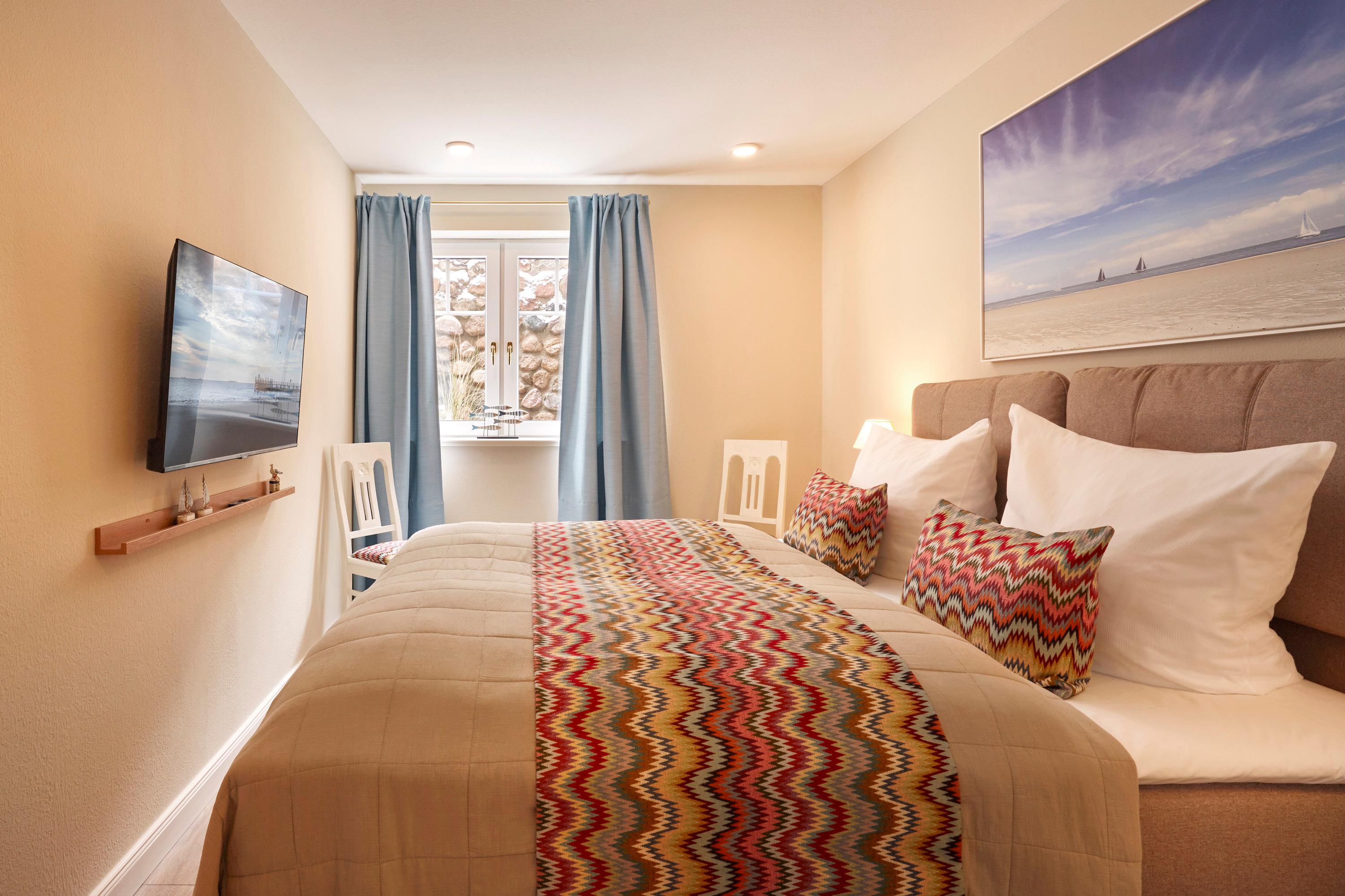 Die drei Schlafzimmer – Nis Puk, Lille Peer und Pidder Lyng– tragen die Namen friesischer Sagengestalten und schaffen mit individuellen Akzenten eine ruhige, harmonische Rückzugsatmosphäre. Alle Räume sind mit Smart TV auf dem neuesten Stand.