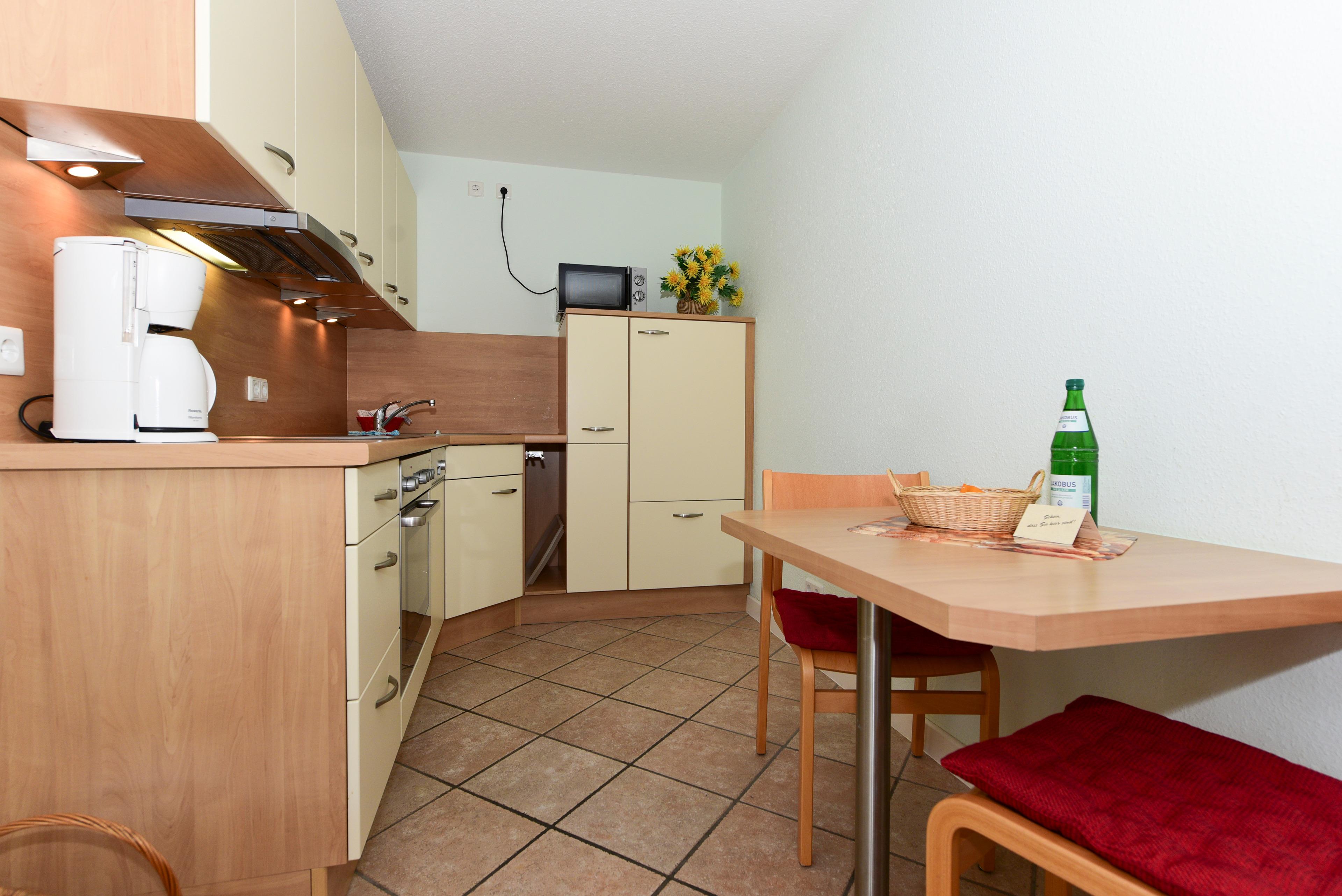 Die Wohnung 02 bietet ein helles und einladendes Wohnzimmer, das mit mehreren Sitzmöglichkeiten ausgestattet ist. Hier können Sie sich entspannen oder den seitlichen Balkon genießen, der zusätzlichen Raum zum Erholen bietet. Die moderne Einbauküche ist vollständig ausgestattet und verfügt über einen Essplatz für zwei Personen – perfekt für gemütliche Mahlzeiten zu zweit.