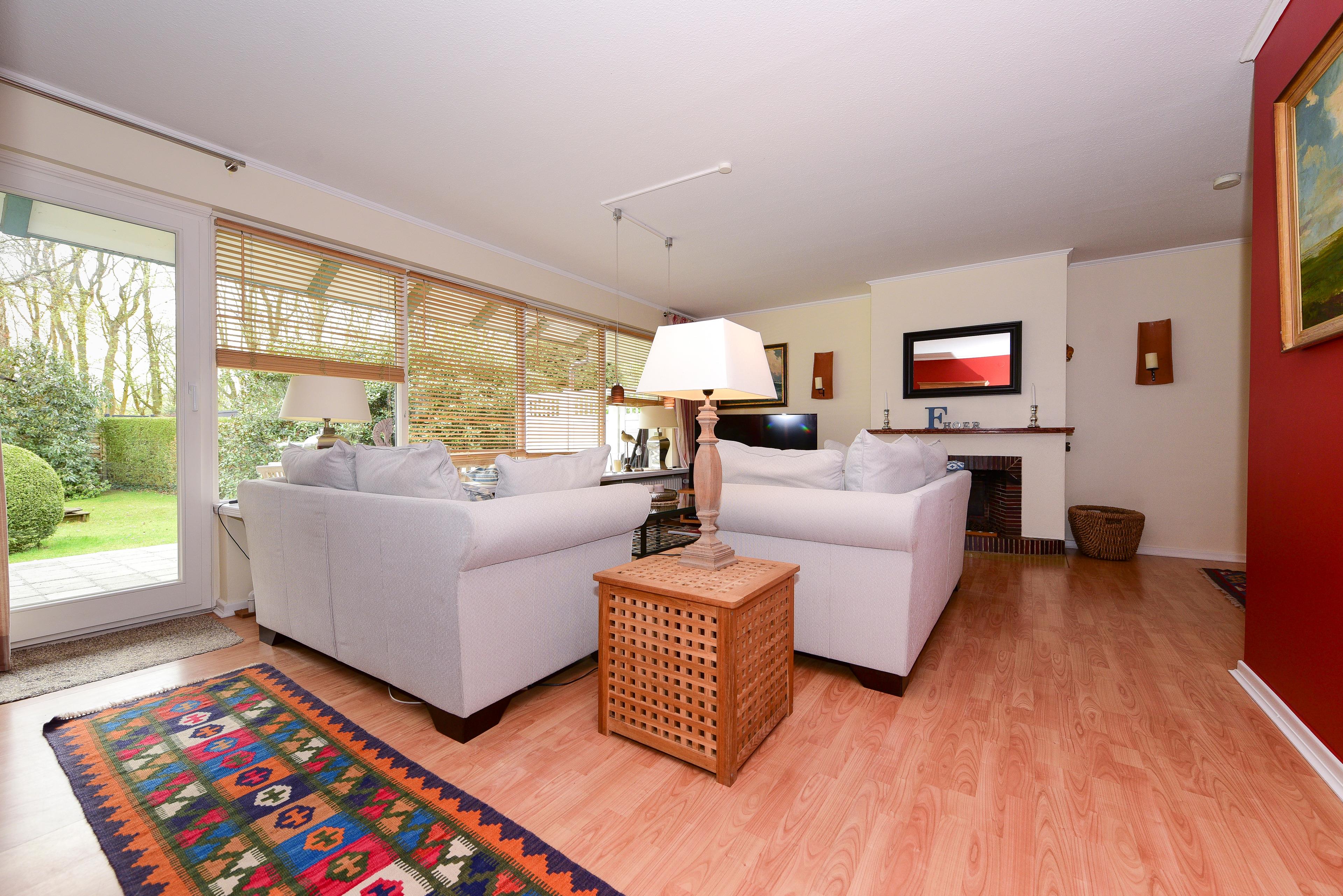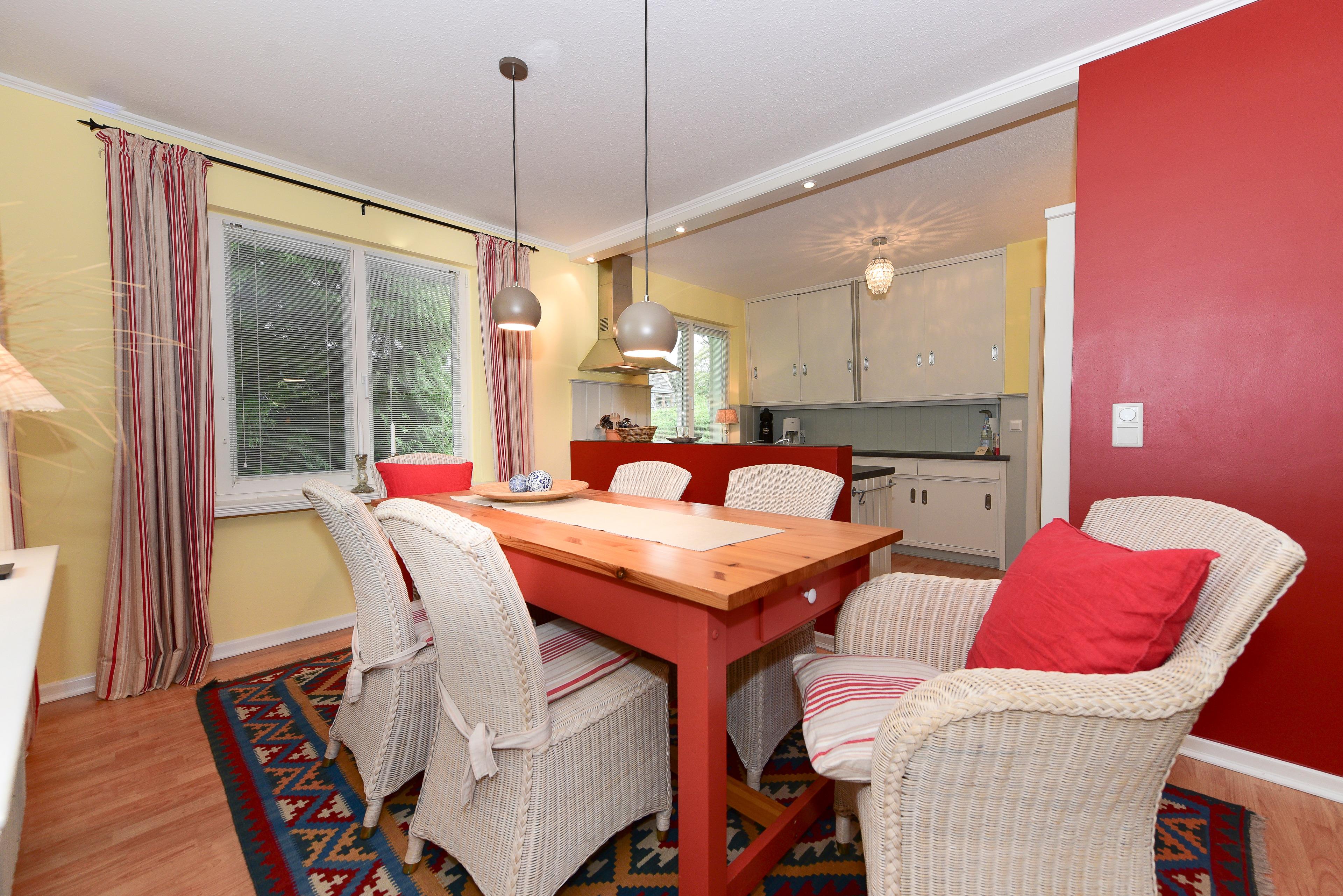 Das großzügige Wohn-Esszimmer ist lichtdurchflutet und lädt mit harmonischen Farben und liebevollen Details zum Entspannen ein. Die bequemen Sofas bieten einen herrlichen Blick auf den großen, idyllischen Garten, der mit altem Baumbestand und blühenden Hecken zum Verweilen einlädt. Der Kamin trägt zur heimeligen Atmosphäre bei, auch wenn er nicht aktiv ist. Vom Essbereich aus, der sich offen zur Küche hin zieht, genießen Sie nicht nur Ihre Mahlzeiten, sondern auch das Gefühl, mitten im Geschehen zu sein. Der Essbereich bietet Platz für fünf Personen – ideal für gesellige Runden.
