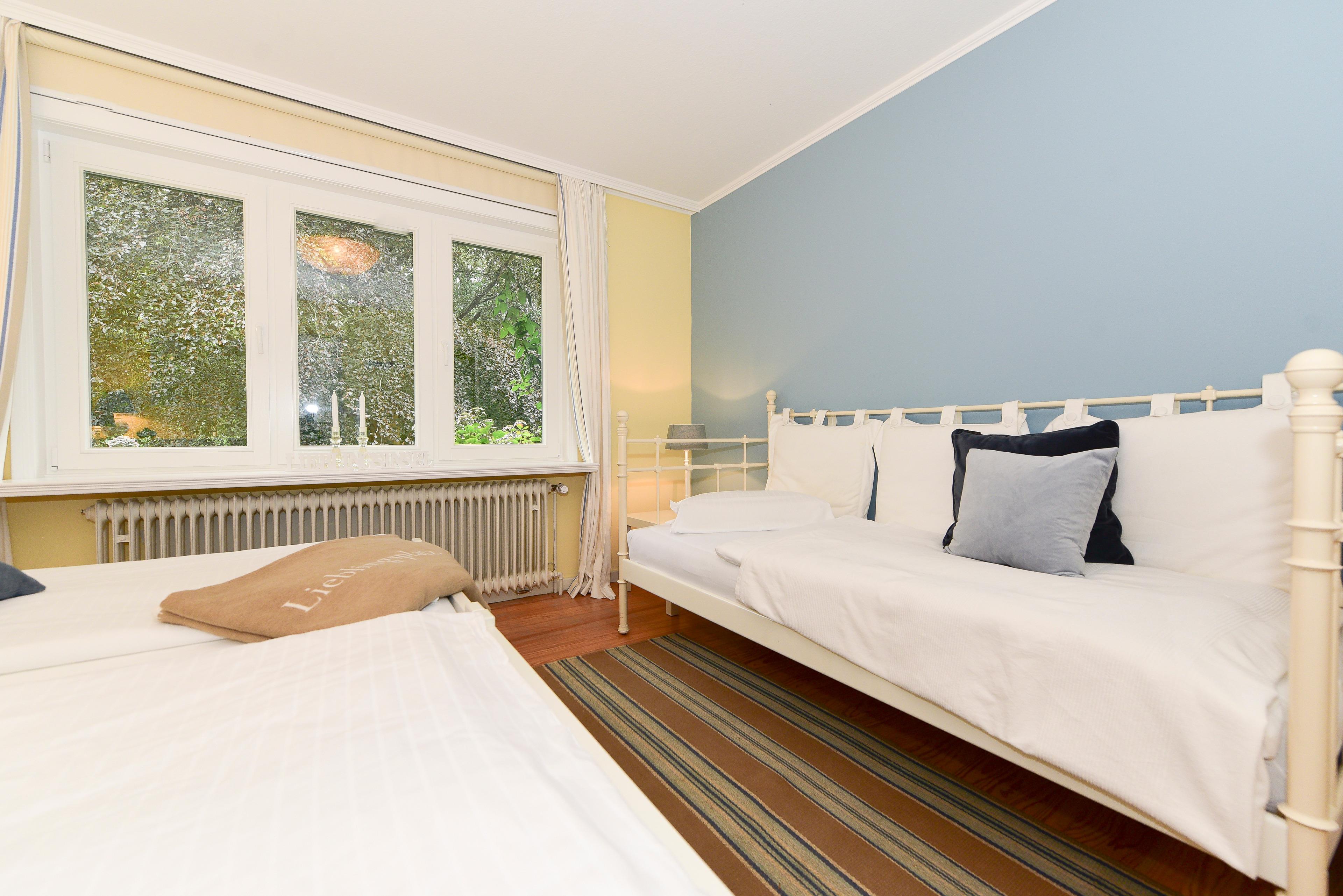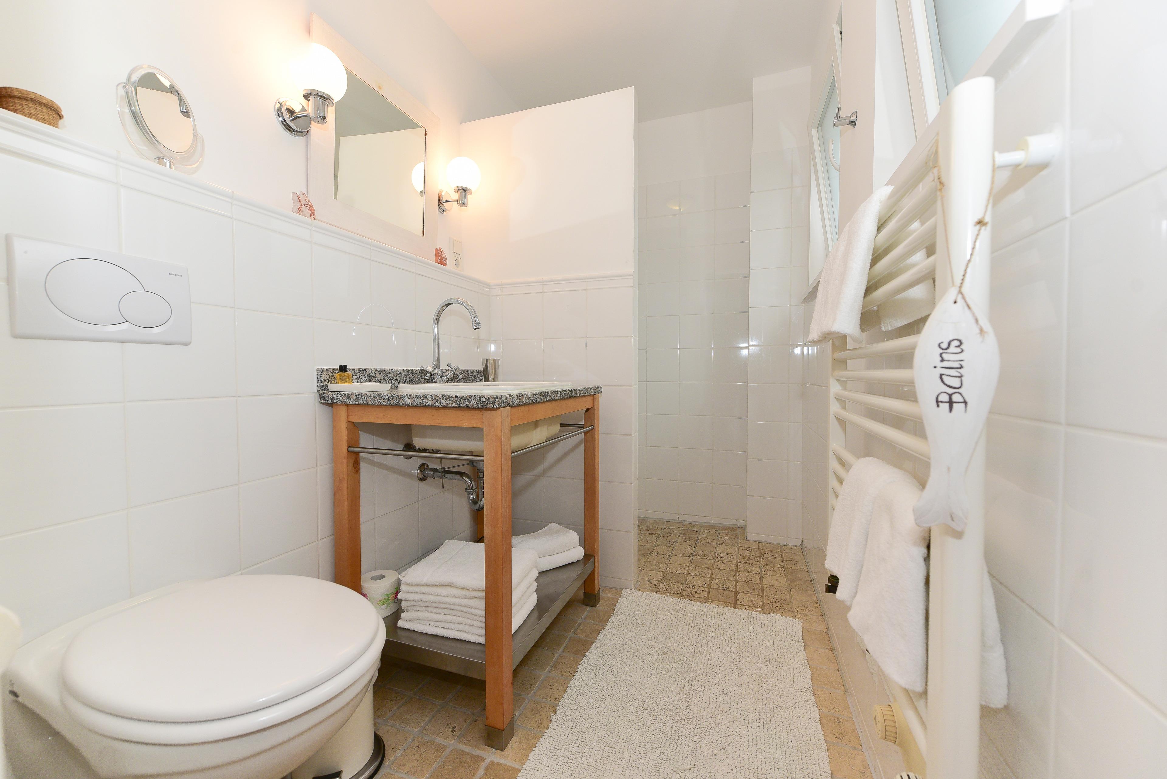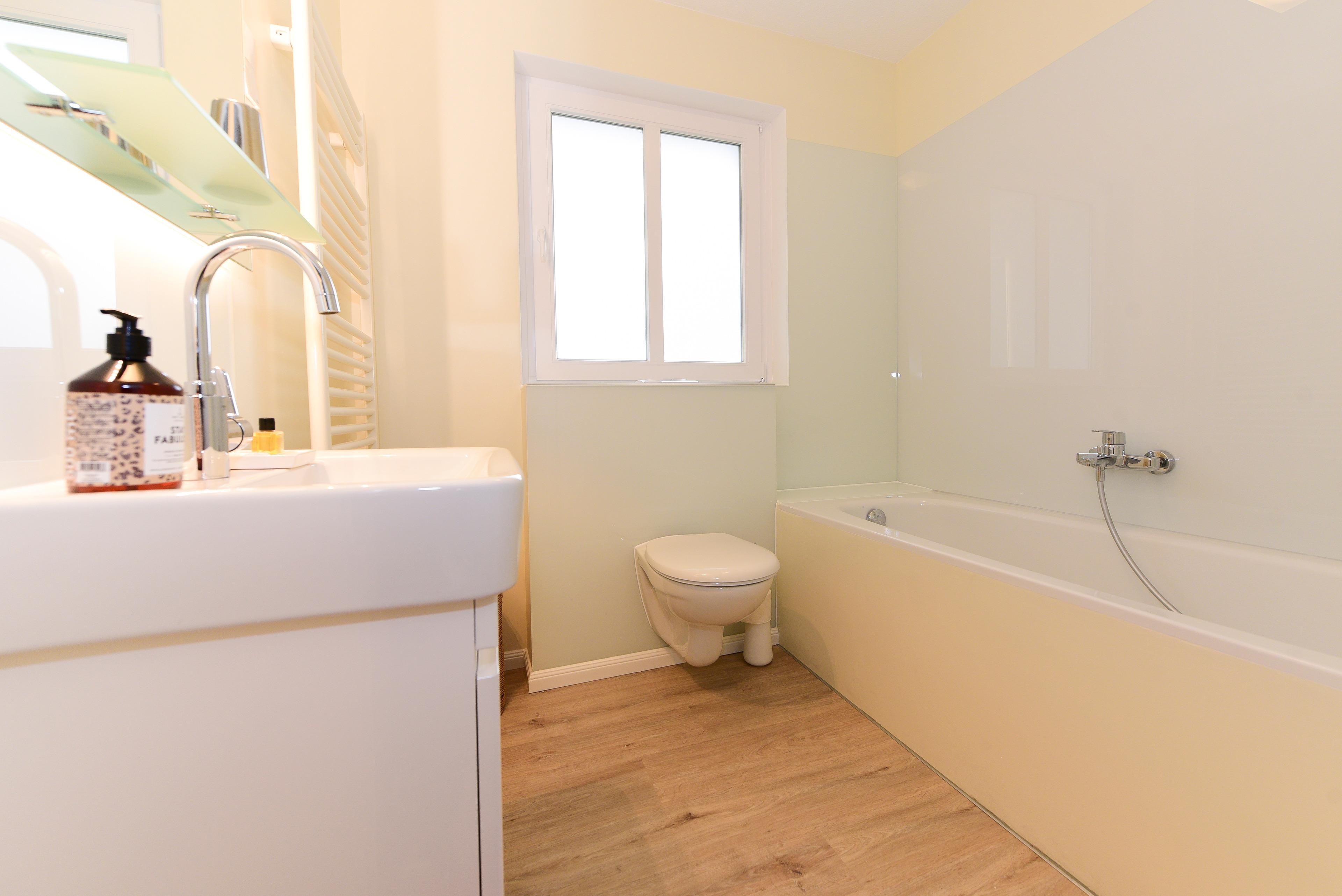 Das Haus bietet zwei geräumige Schlafzimmer. Das renovierte Schlafzimmer mit Doppelbett liegt ruhig zum Garten hin und garantiert dank der Lage am Waldrand erholsame Nächte. Im zweiten Schlafzimmer finden sich drei Einzelbetten, ideal für Familien oder Freunde. Vom zweiten Schlafzimmer gelangen Sie ins Wannenbad, das mit freundlichen Farben und einer beruhigenden Atmosphäre verzaubert. Das zweite Badezimmer, das vom Flur aus erreichbar ist, bietet einen großen, ebenerdigen Duschbereich, der durch das Tageslicht besonders einladend wirkt.