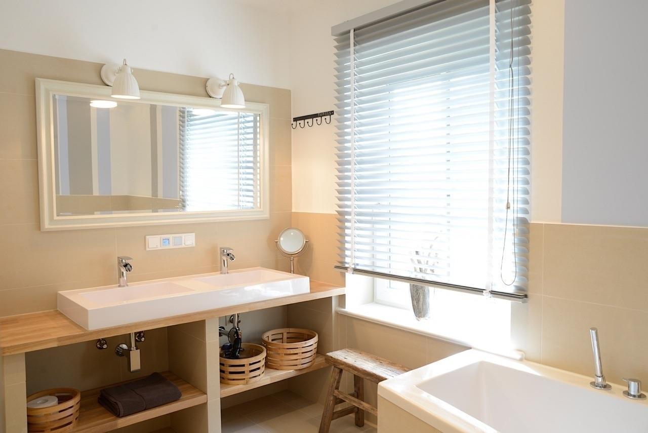 Ein großzügiges Badezimmer mit einer Badewanne, die Lichttherapie bietet, sowie eine Regendusche lädt im Erdgeschoss zum Entspannen ein.