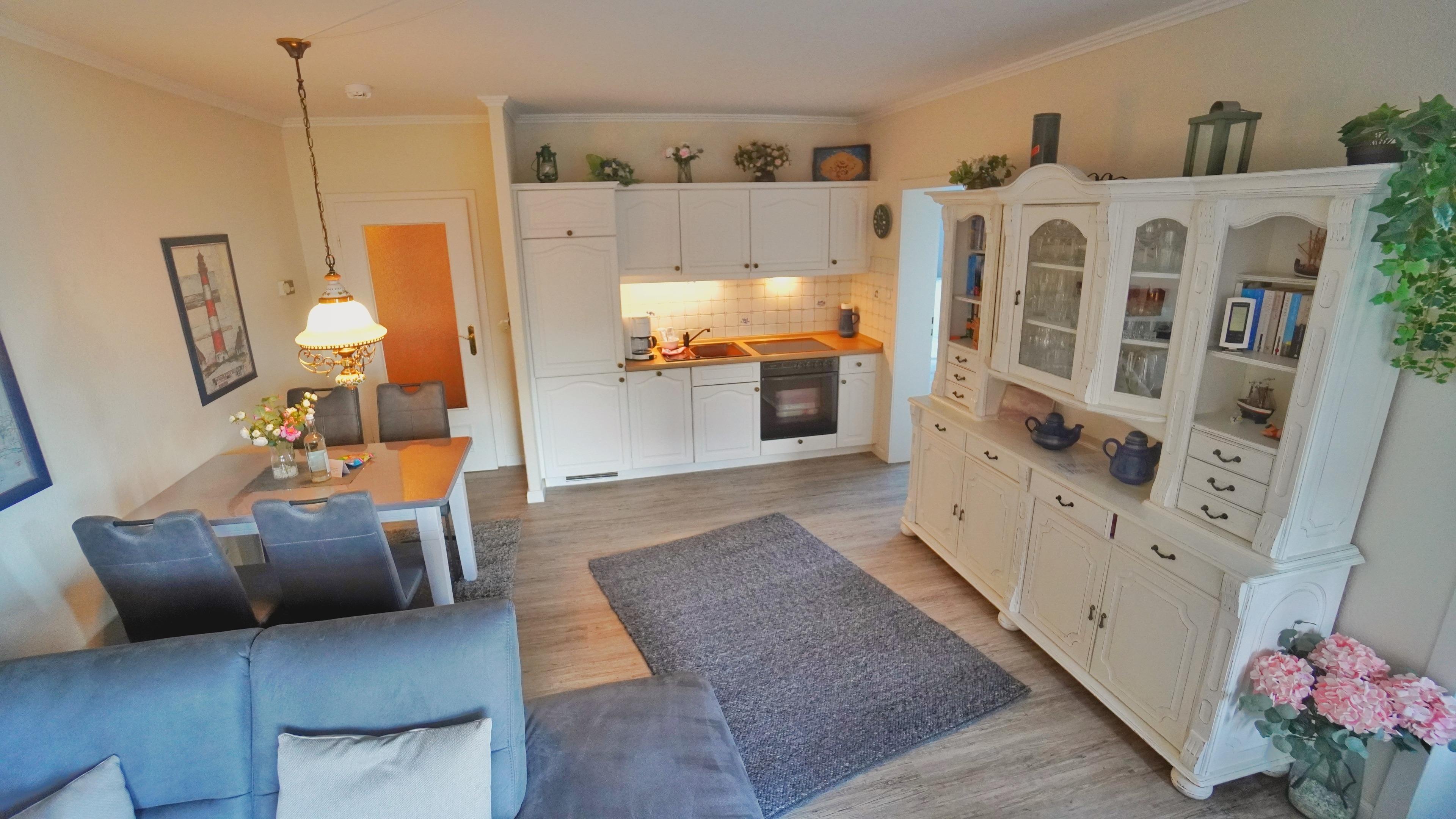 Das großzügige Wohnzimmer mit integrierter Küchenzeile und einem Esstisch für vier Personen ist der ideale Ort, um gemeinsam Zeit zu verbringen. Für Unterhaltung sorgen ein Flachbildschirm und eine Stereoanlage, die den Wohnbereich perfekt abrunden.