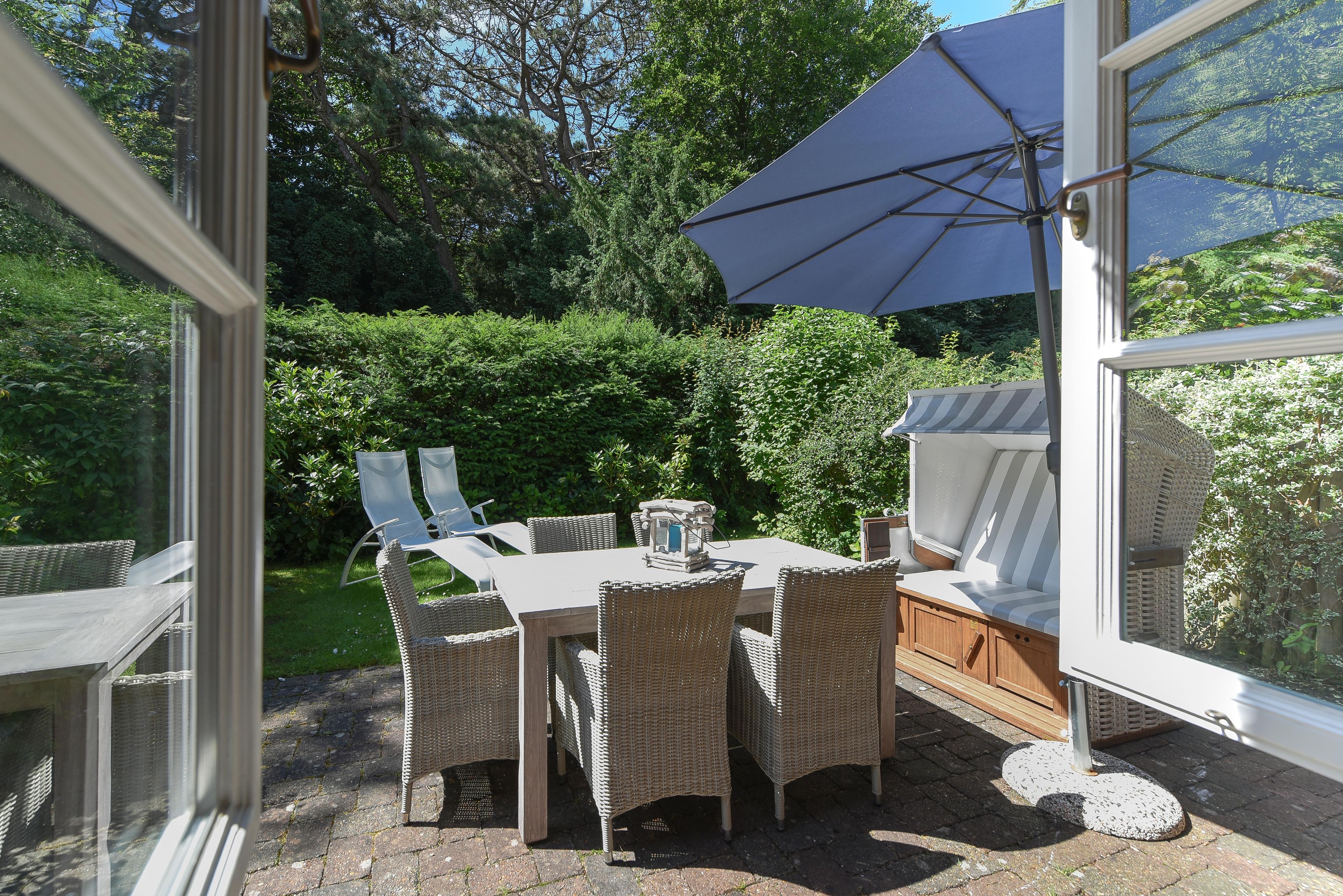 Vom Wohnzimmer gelangen Sie in den sonnigen Gartenteil, welcher mit dem gemütlichem Strandkorb auf der Terrasse und den bequemen Gartenmöbeln zum Verweilen einlädt, während der angrenzende Wald für Ruhe und Erholung sorgt.