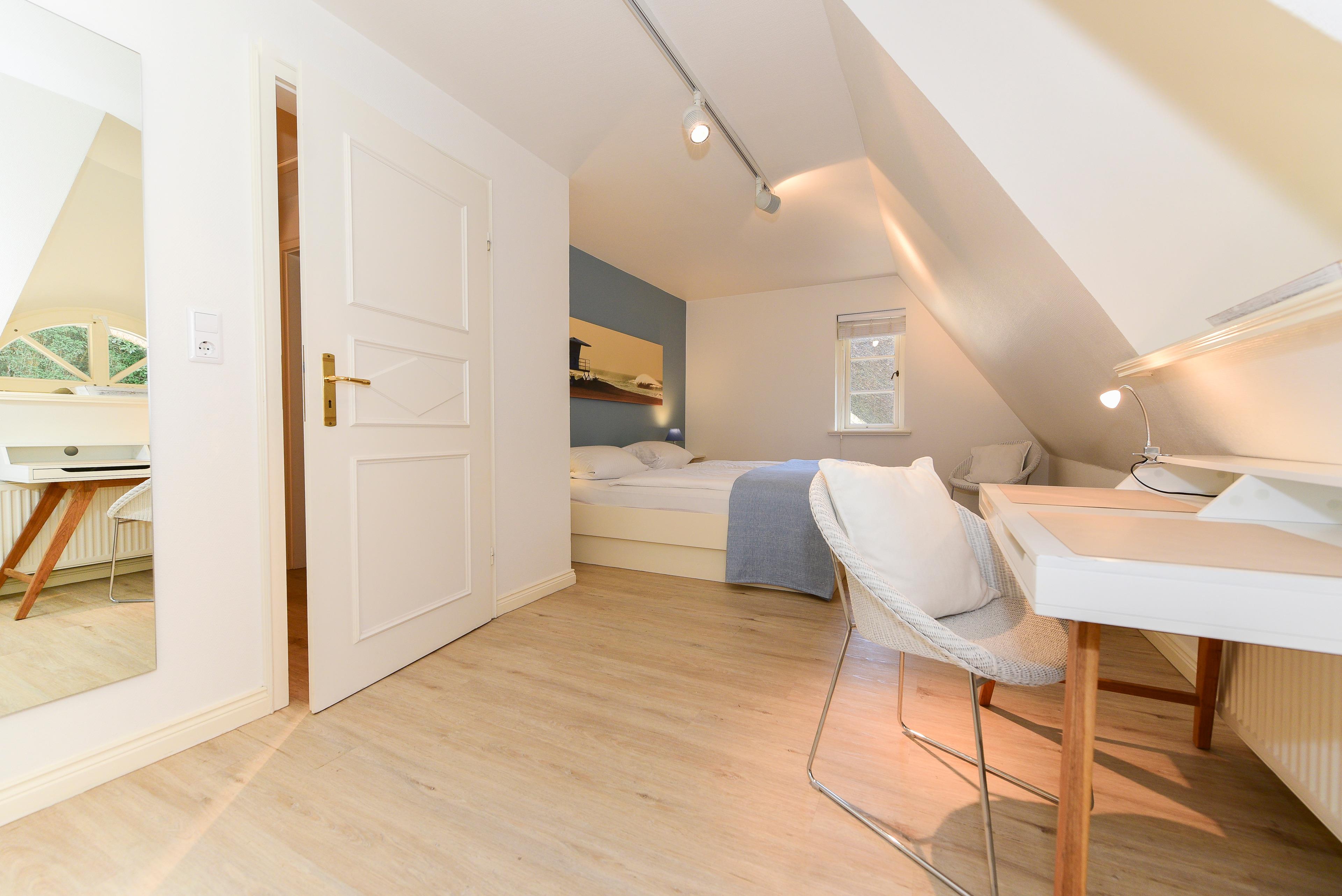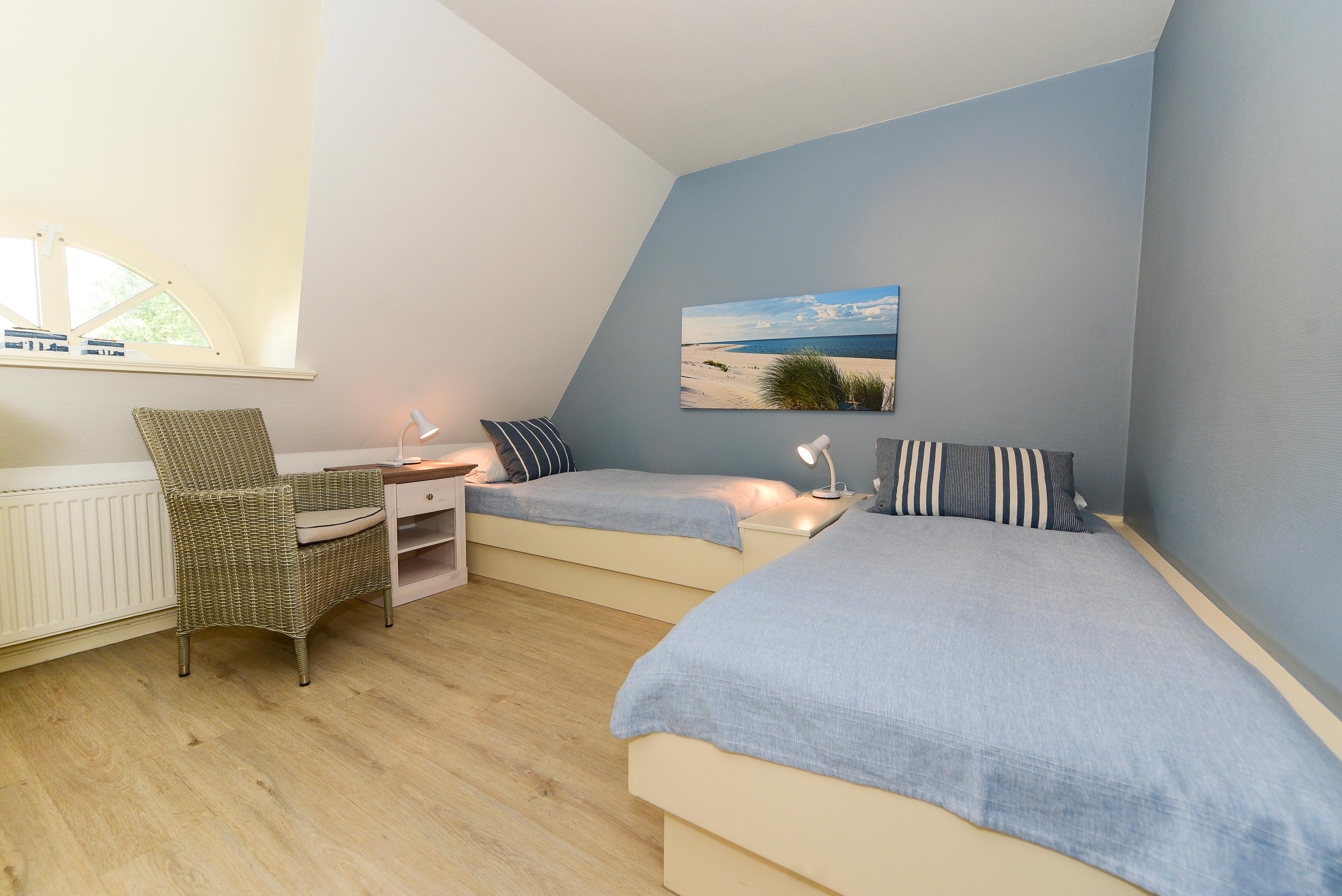 Im Obergeschoss befindet sich ein geräumiges Schafzimmer mit komfortablem Doppelbett und viel Stauraum sowie ein weiteres Schlafzimmer mit zwei Einzelbetten - perfekt für Kinder oder Erwachsene. Ein Kinderbett für die kleinsten Gäste ist inklusive.