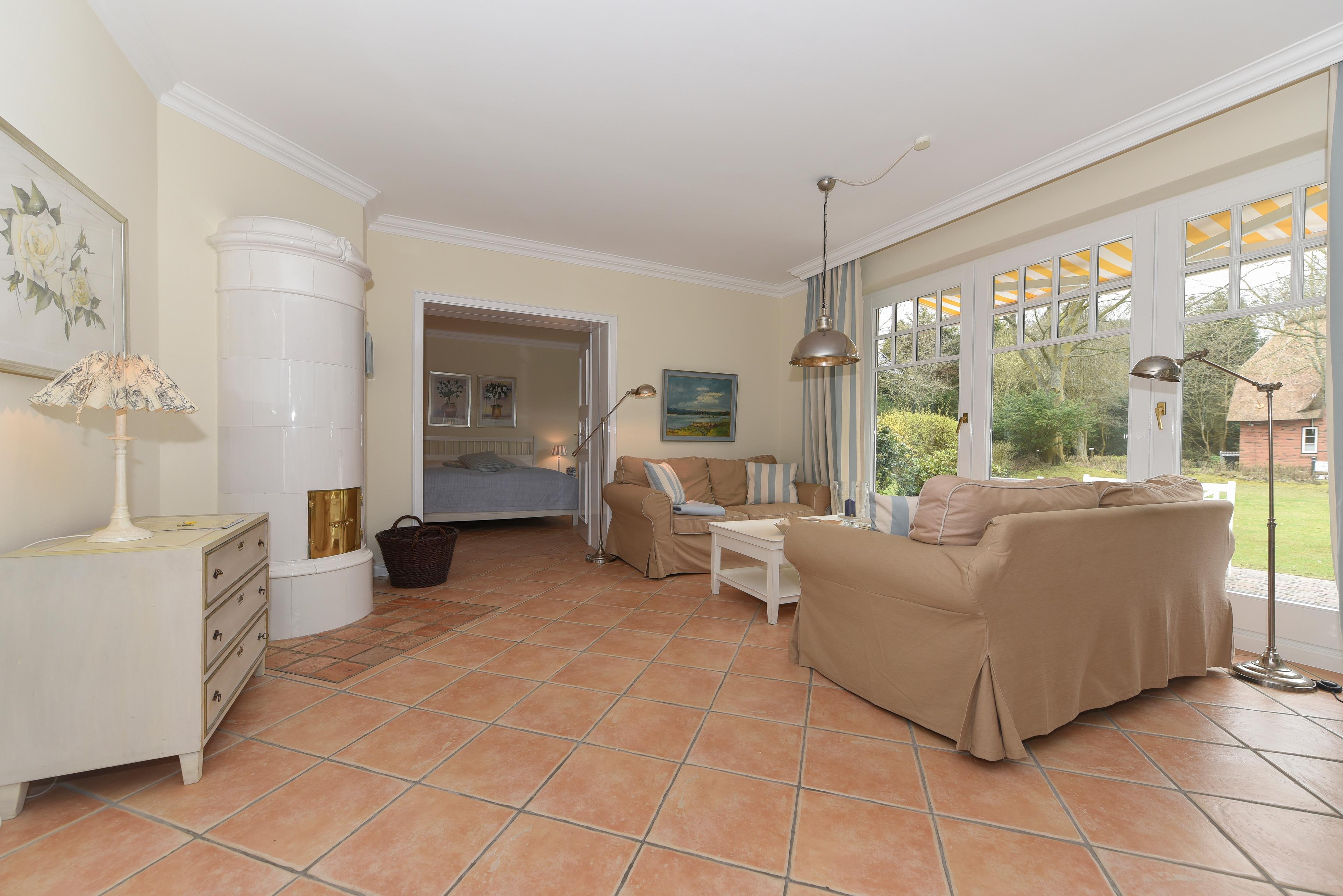 Hier finden Sie ein großzügiges, mit hochwertigen Möbeln ausgestattetes Wohnzimmer mit Kachelofen, eine gemütliche Essecke und große Flügeltüren, welche auf die sonnige Südterrasse führen.