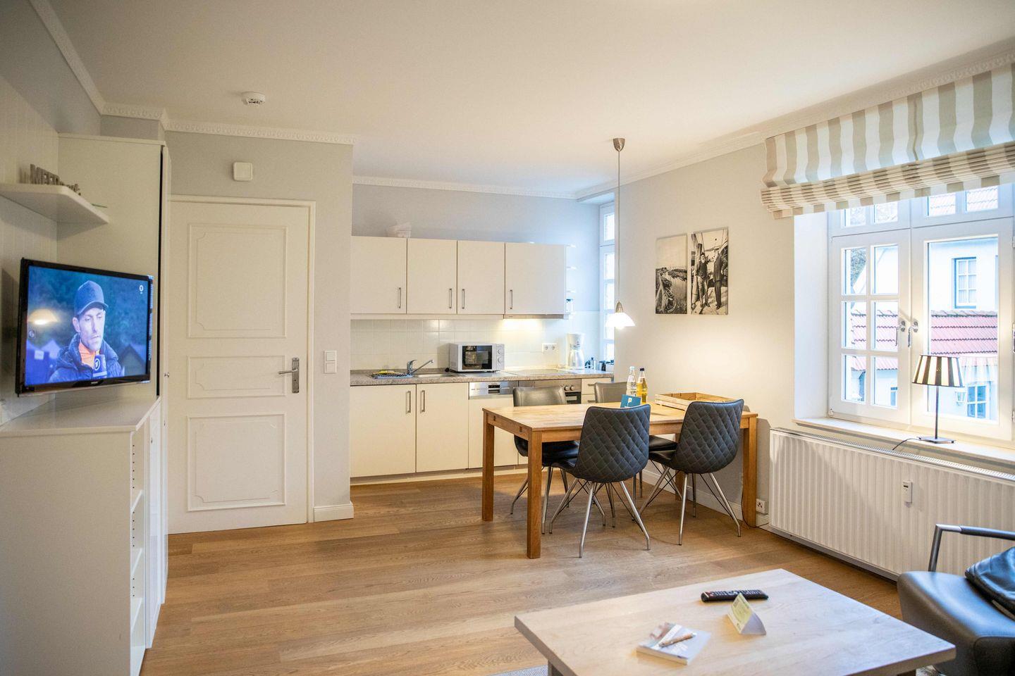 Die Wohnung verfügt über eine moderne Küchenzeile, die mit allen Annehmlichkeiten ausgestattet ist, die Sie für die Zubereitung Ihrer Lieblingsgerichte benötigen. Ein Backofen, eine Geschirrspülmaschine und eine Mikrowelle stehen Ihnen zur Verfügung, um Ihre kulinarischen Künste zu entfalten. Nehmen Sie Platz am Esstisch und genießen Sie gemeinsame Mahlzeiten in gemütlicher Atmosphäre.