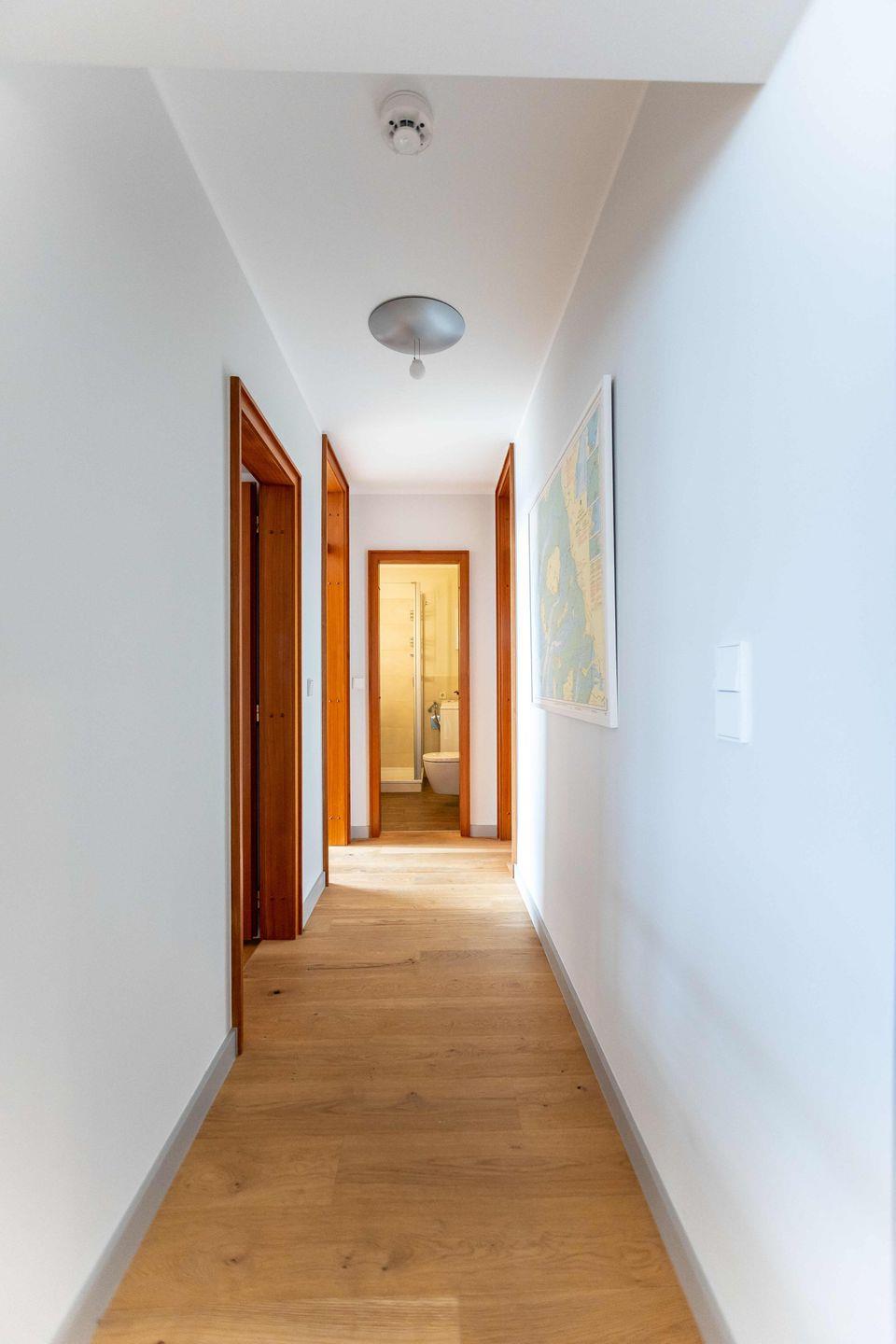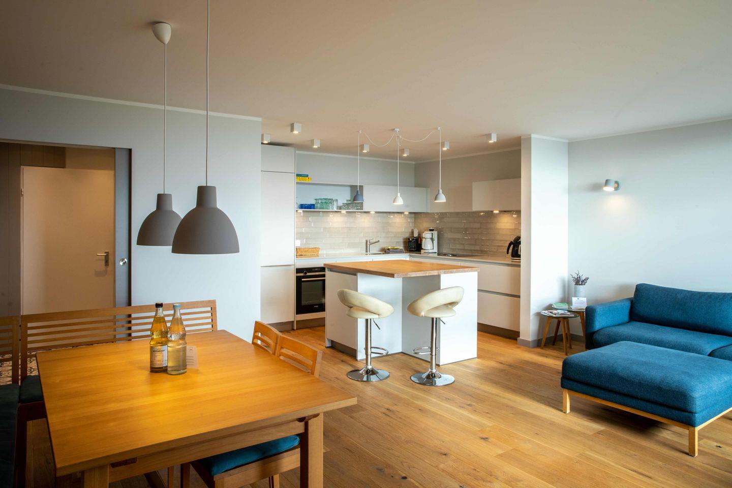 Der kombinierte Wohn-, Ess- und Küchenbereich ist das Herzstück der Wohnung. Ob von der urigen Holz-Sitzecke mit Esstisch, vom Sofa oder vom Tresen aus der Küche: von überall ist der Blick auf das Meer zu genießen. Ein überdachter Balkon ist vom Wohnzimmer aus zu betreten, der andere vom Schlafzimmer. Eine neu gestaltete praktische Garderobe, ein Duschbad und zwei Schlafzimmer mit je einem Doppelbett (je 1,80m breit) komplettieren auf insgesamt 78qm die liebevoll eingerichtete und rund um das Jahr gut nutzbare Ferienwohnung.