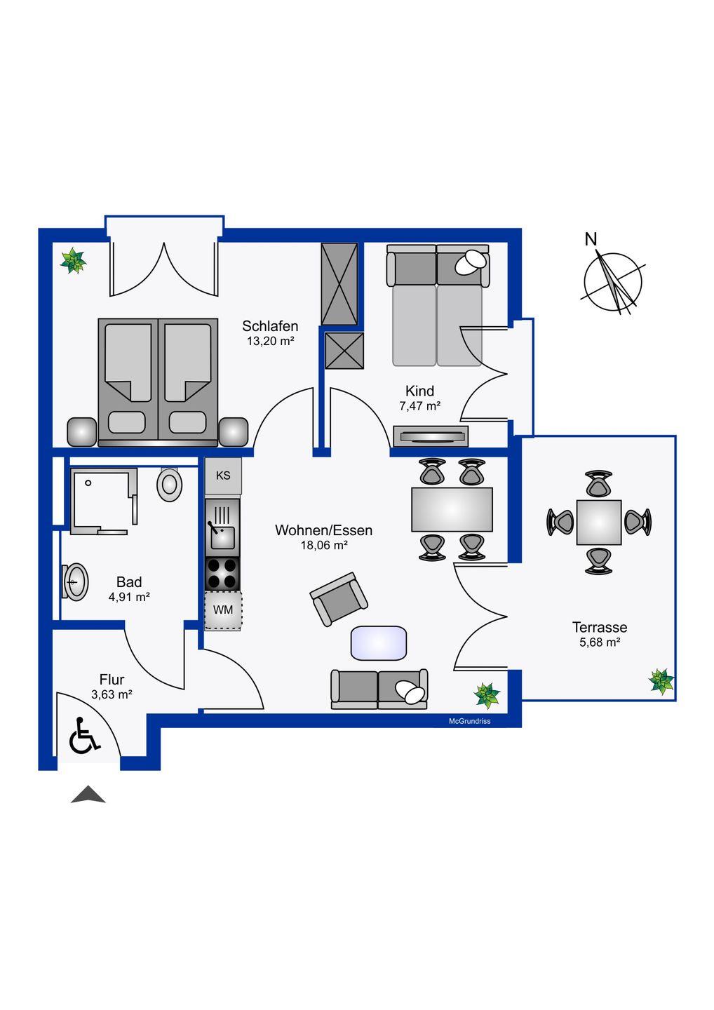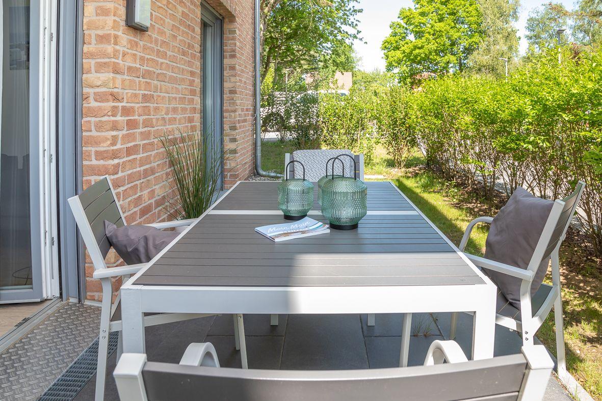 Eines der Highlights der Wohnung ist die angrenzende Terrasse, die mit hochwertigen Gartenmöbeln ausgestattet ist und zu gemütlichen Abenden im Freien einlädt. Hier können Sie die frische Luft genießen und sich nach einem langen Tag am Strand entspannen.