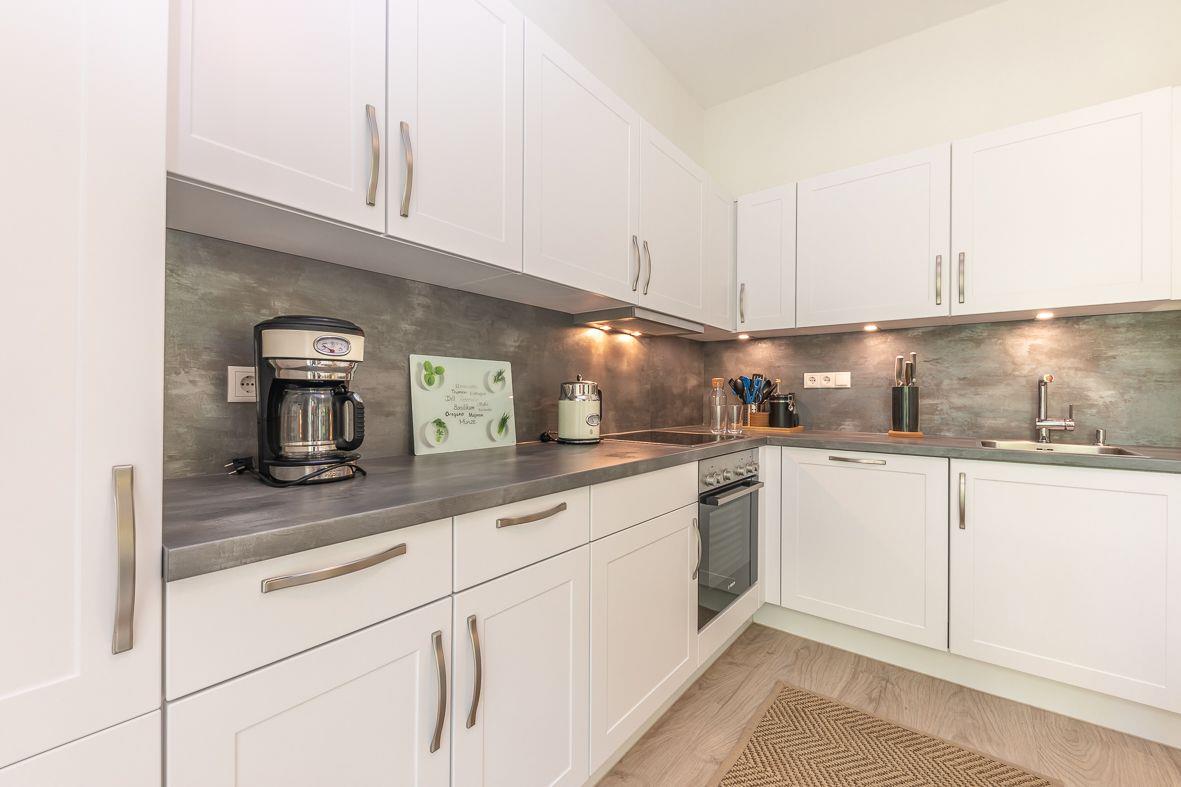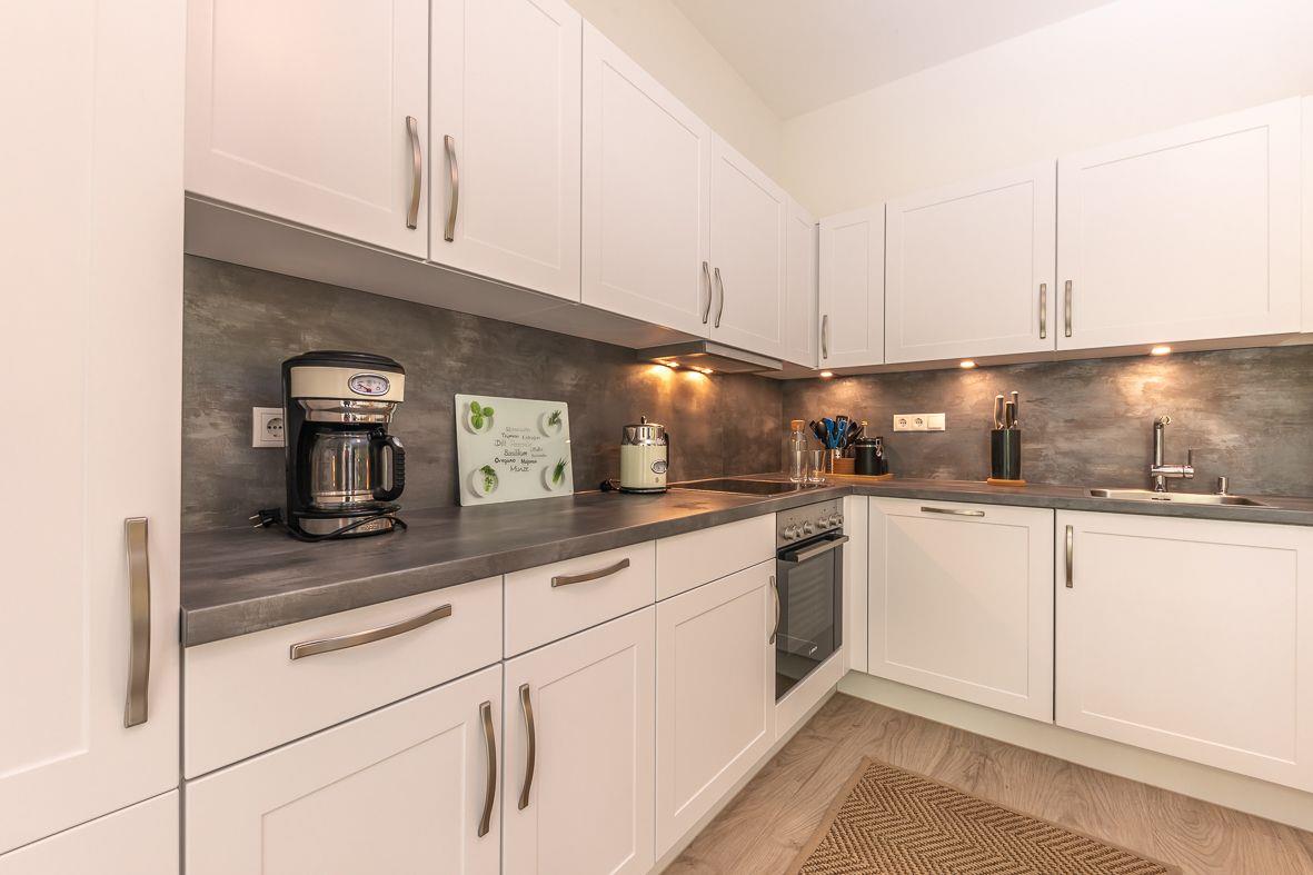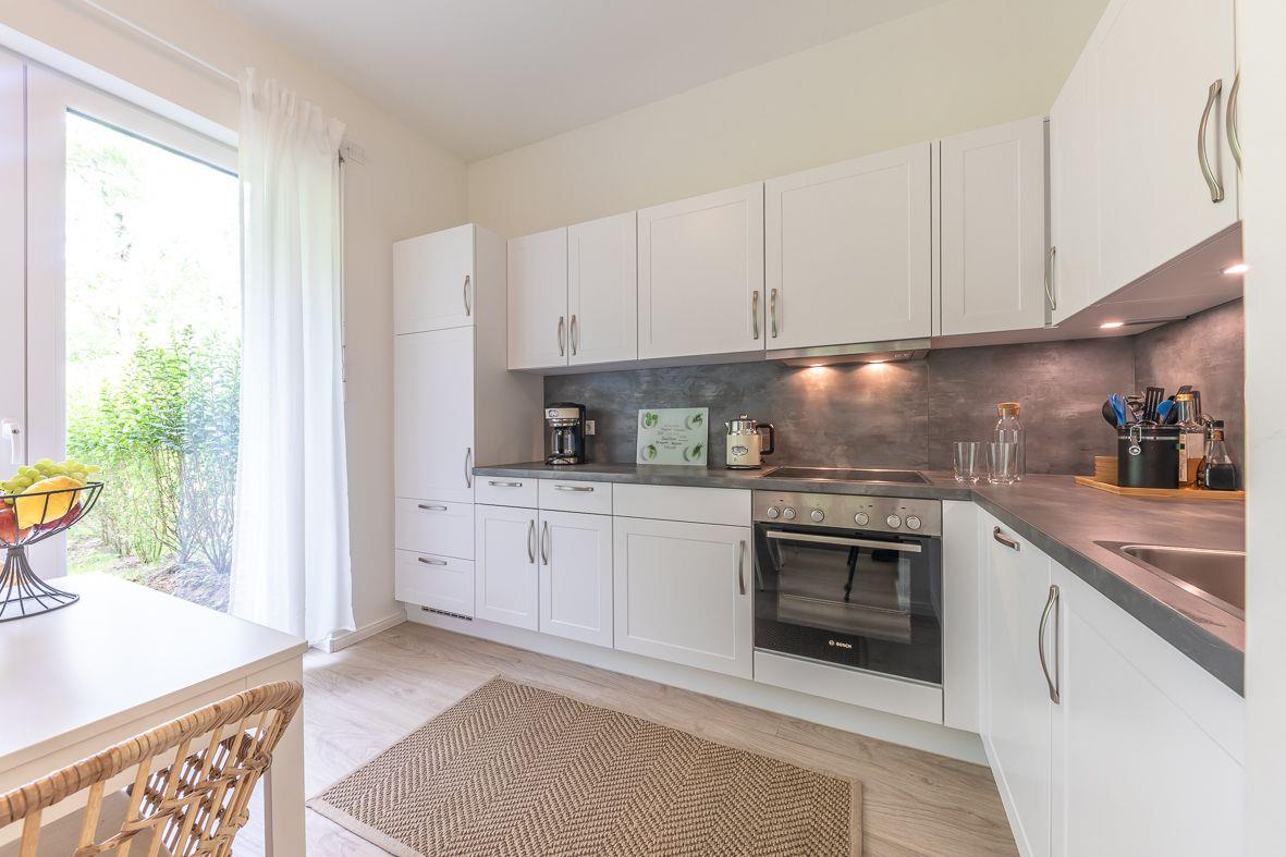 Über den Eingang im westlich gelegenen Neubau gelangen Sie in die Wohnung. Im Erdgeschoss finden Sie ein zusätzliches Duschbad, eine moderne, offene Küche mit Ceranfeld, Backofen und Kaffeemaschine sowie den angrenzenden Wohn- und Essbereich. Hier wurde der skandinavische Stil mit der Modernen harmonisch vereint. Selbstverständlich sind ein Flachbildfernseher und ein Internetzugang vorhanden. Im Gästezimmer können Sie zusätzlich fernsehen.