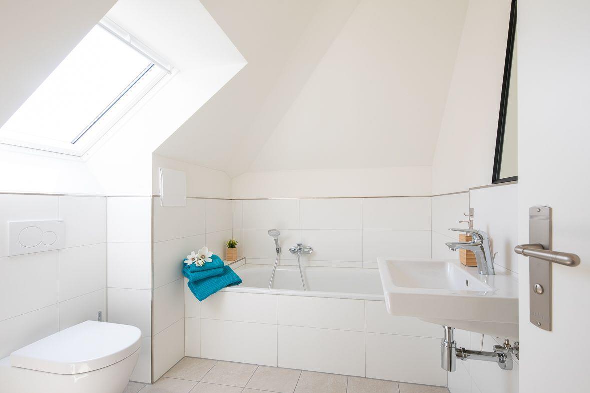 Ein Highlight der Ferienwohnung ist die Dachterrasse, die sowohl vom Wohnzimmer als auch von den beiden Schlafzimmern begehbar ist. Ein Badezimmer ist hell gestaltet und mit einer ebenerdigen Dusche ausgestattet. Die beiden Schlafzimmer mit je einem Doppelbett (180*200) befinden sich ebenfalls im 2. Obergeschoss. Über die Treppe gelangen Sie zu einem weiteren Highlight der Ferienwohnung: Das zweite Badezimmer, das über eine Badewanne und Tageslicht verfügt. Zusätzlich gibt es in diesem offenen Dachbodenbereich ein Tandembett, das zu einer Liegefläche mit 160*200cm erweitert werden kann
