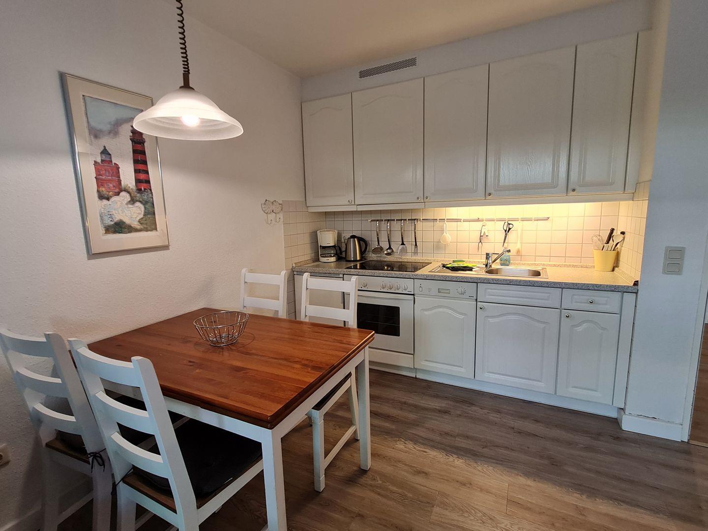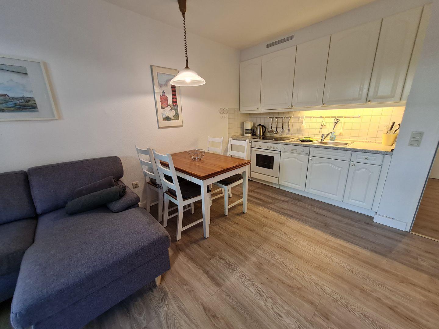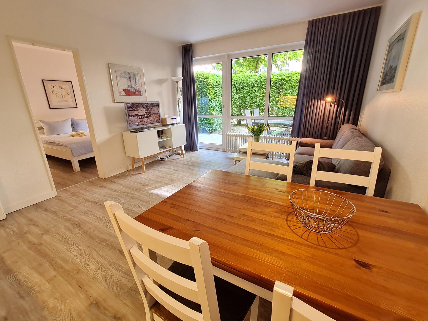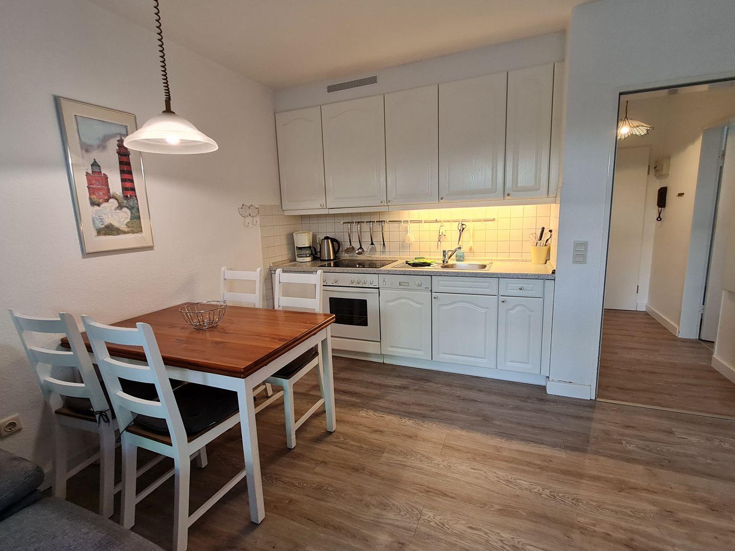 Die Wohnung besitzt neben dem Wohnraum mit Esstisch und angrenzender Einbauküche, zwei Schlafzimmer und ein Duschbad. Im Wohnzimmer finden Sie ein Esstisch mit 4 Stühlen, sowie ein bequemes Ecksofa vor. Für die Unterhaltung sorgen Flachbild-Kabel-TV, Stereo-Anlage, DVD-Player und einige Bücher. Die Küche verfügt über ein Ceran-Kochfeld, Backofen, Kühlschrank mit Gefrierfach, Geschirrspüler, Besteck, Geschirr, Töpfe, Toaster, Wasserkocher und Kaffeemaschine. Die zwei Schlafzimmer mit einem Doppelbett (getrennte Matratzen je 90 x 200 cm) und zwei Einzelbetten (je 90 x 200 cm) sorgen für erholsame Nächte während Ihres Urlaubs. Das gepflegte, weiß geflieste Badezimmer verfügt über eine Dusche mit Glaswand, Waschbecken und WC. Im Keller des Hauses stehen Waschmaschine und Trockner gegen Gebühr zur Verfügung.