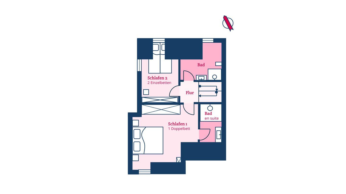 Im Obergeschoss sind die beiden Schlafzimmer - eines mit Doppelbett und eines mit zwei Einzelbetten - sowie zwei der drei Bäder - eines davon en Suite - gelegen.