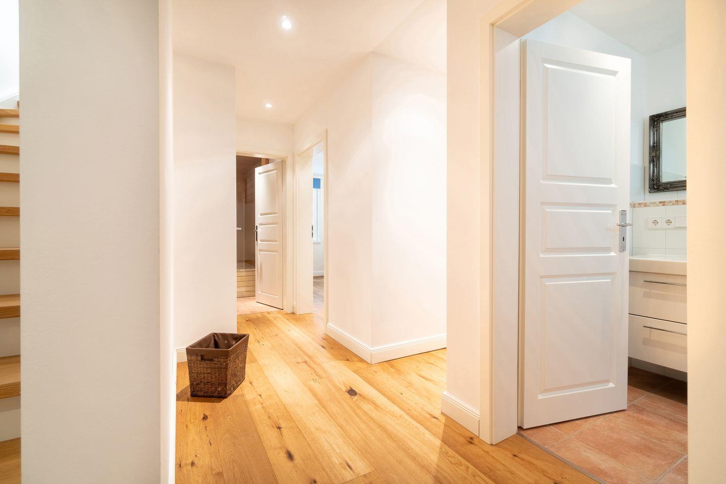 Im Erdgeschoss befinden sich das lichtdurchflutete Wohn- und Esszimmer mit direktem Terrassenzugang und die Küche, die sich über eine Schiebetür vom Wohnbereich trennen lässt, sowie ein Gäste-WC.