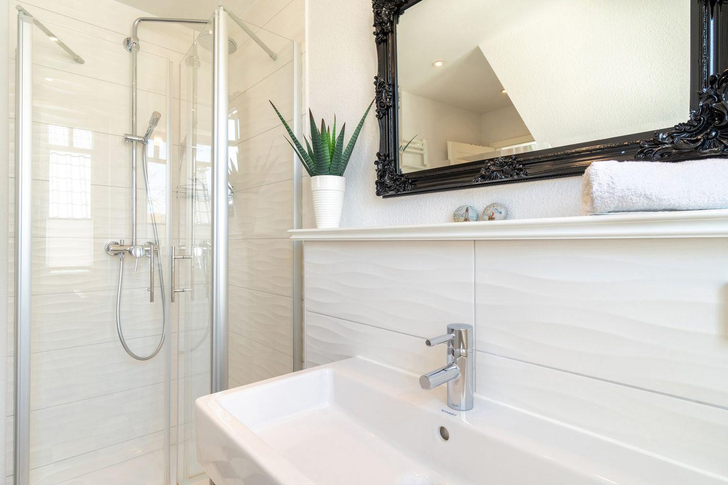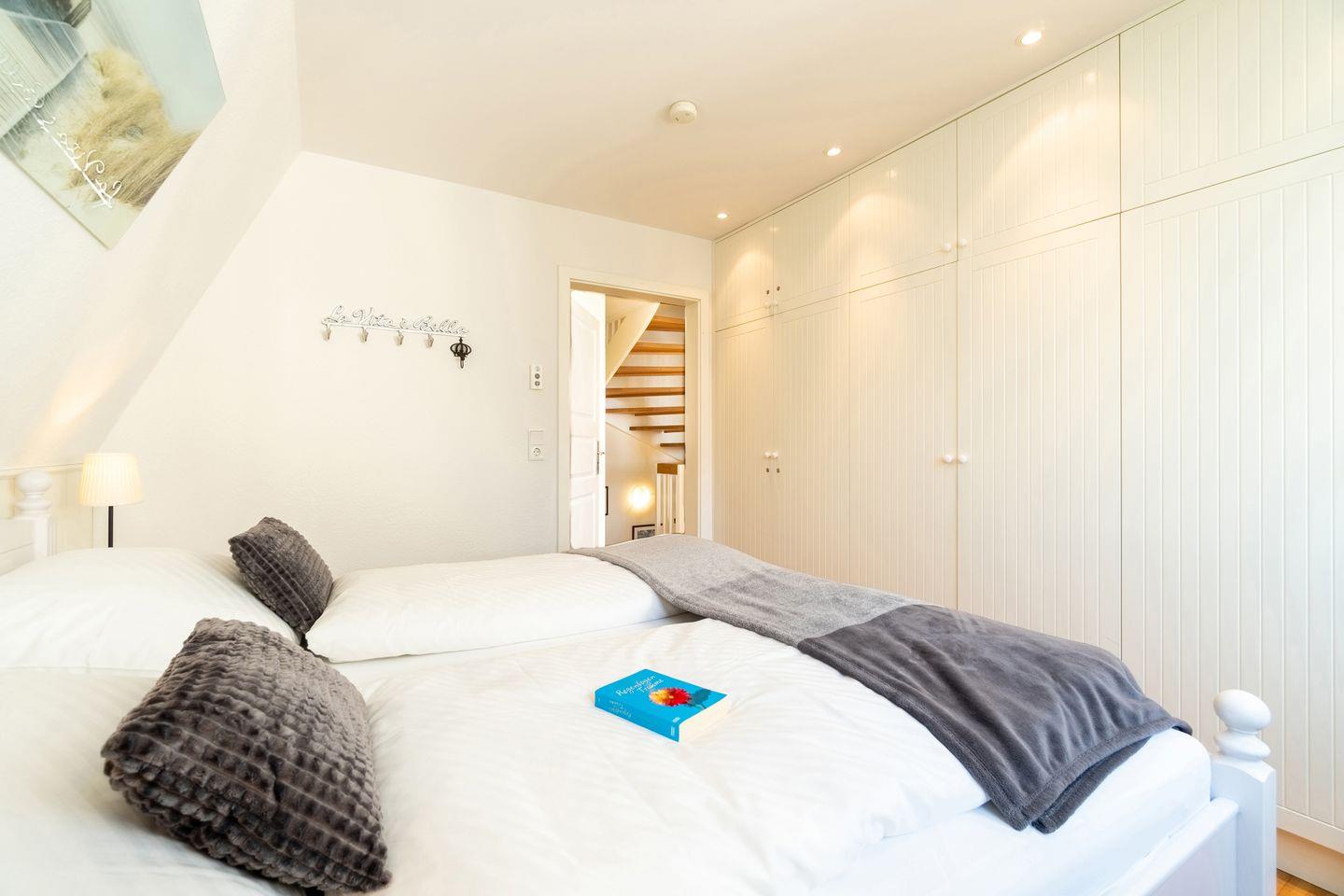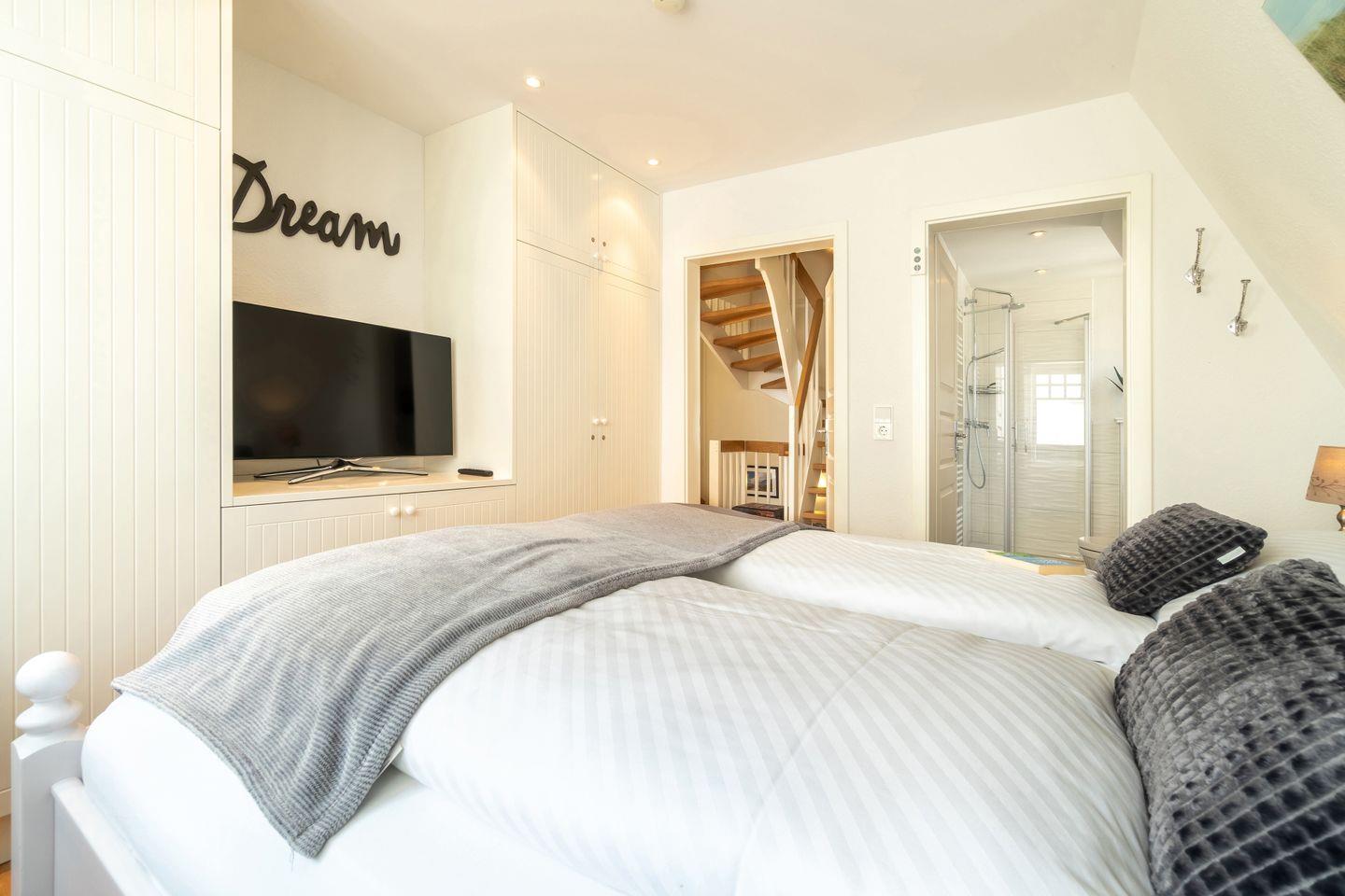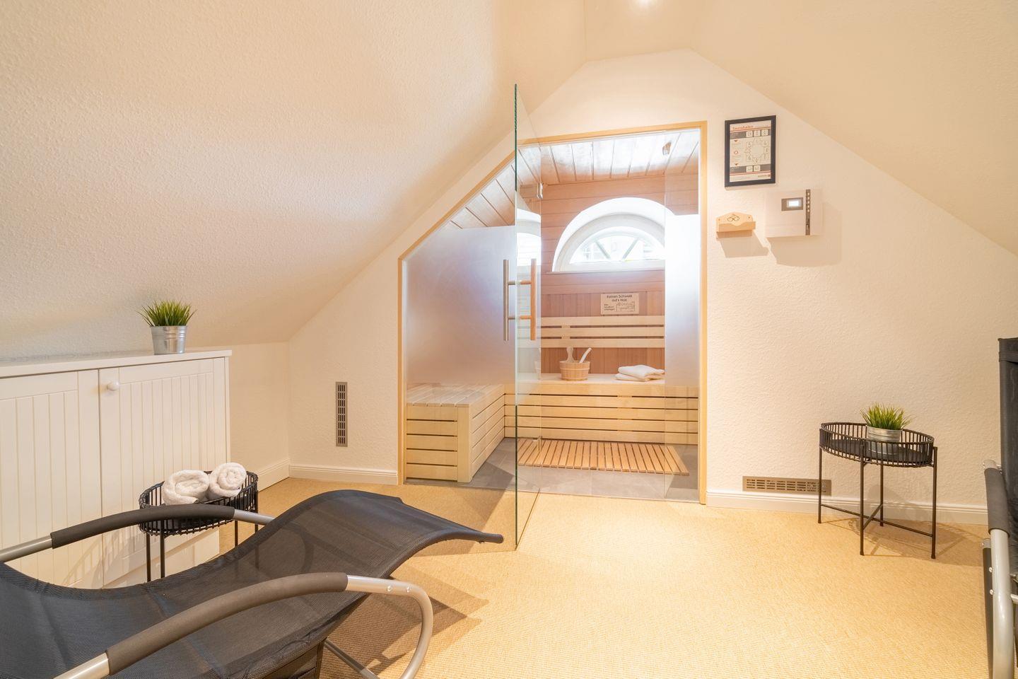 Im Obergeschoss sind die beiden Doppelbett-Schlafzimmer, zwei Duschbäder mit bodengleicher Dusche und die hauseigene Sauna gelegen. Eines der beiden Duschbäder ist en Suite