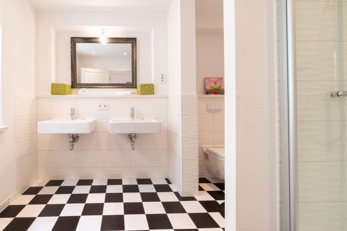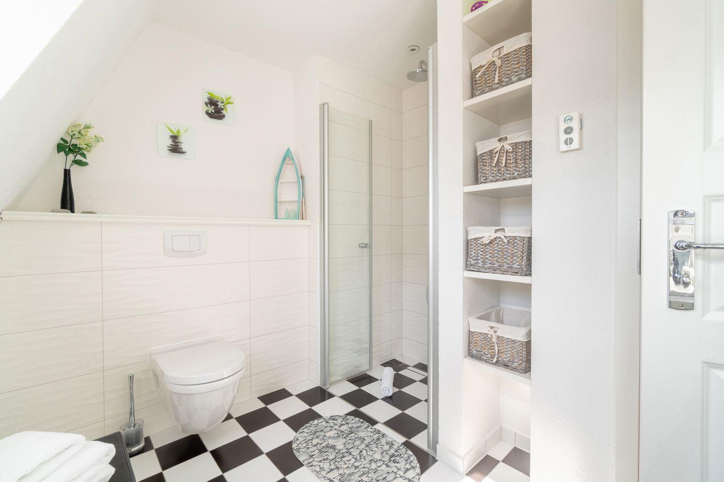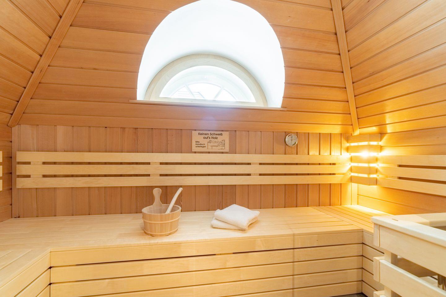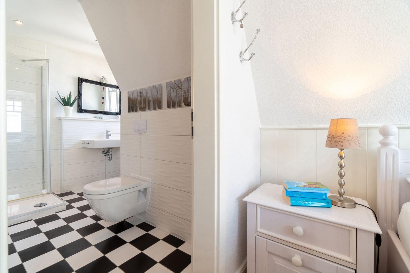 Im Obergeschoss sind die beiden Doppelbett-Schlafzimmer, zwei Duschbäder mit bodengleicher Dusche und die hauseigene Sauna gelegen. Eines der beiden Duschbäder ist en Suite