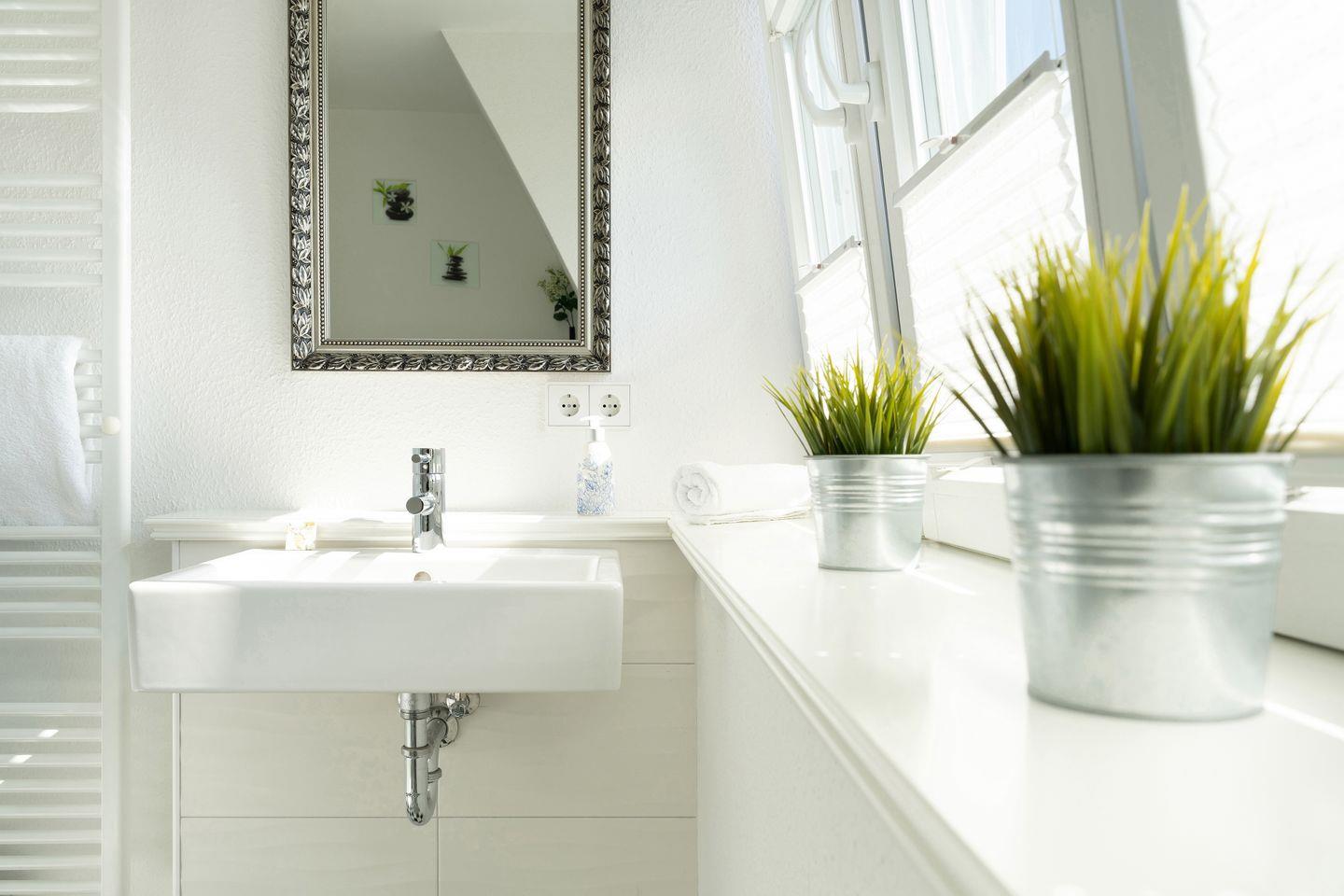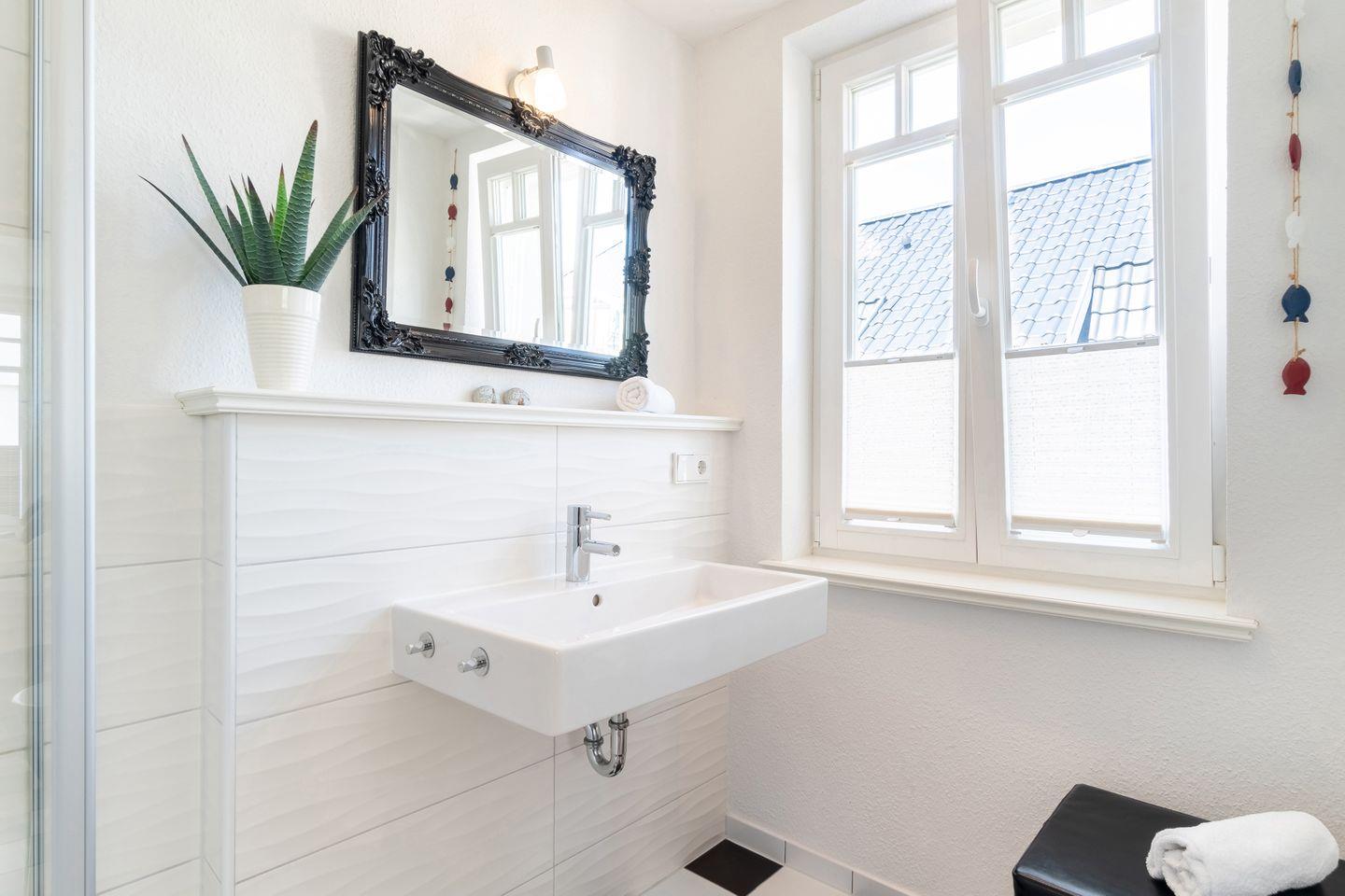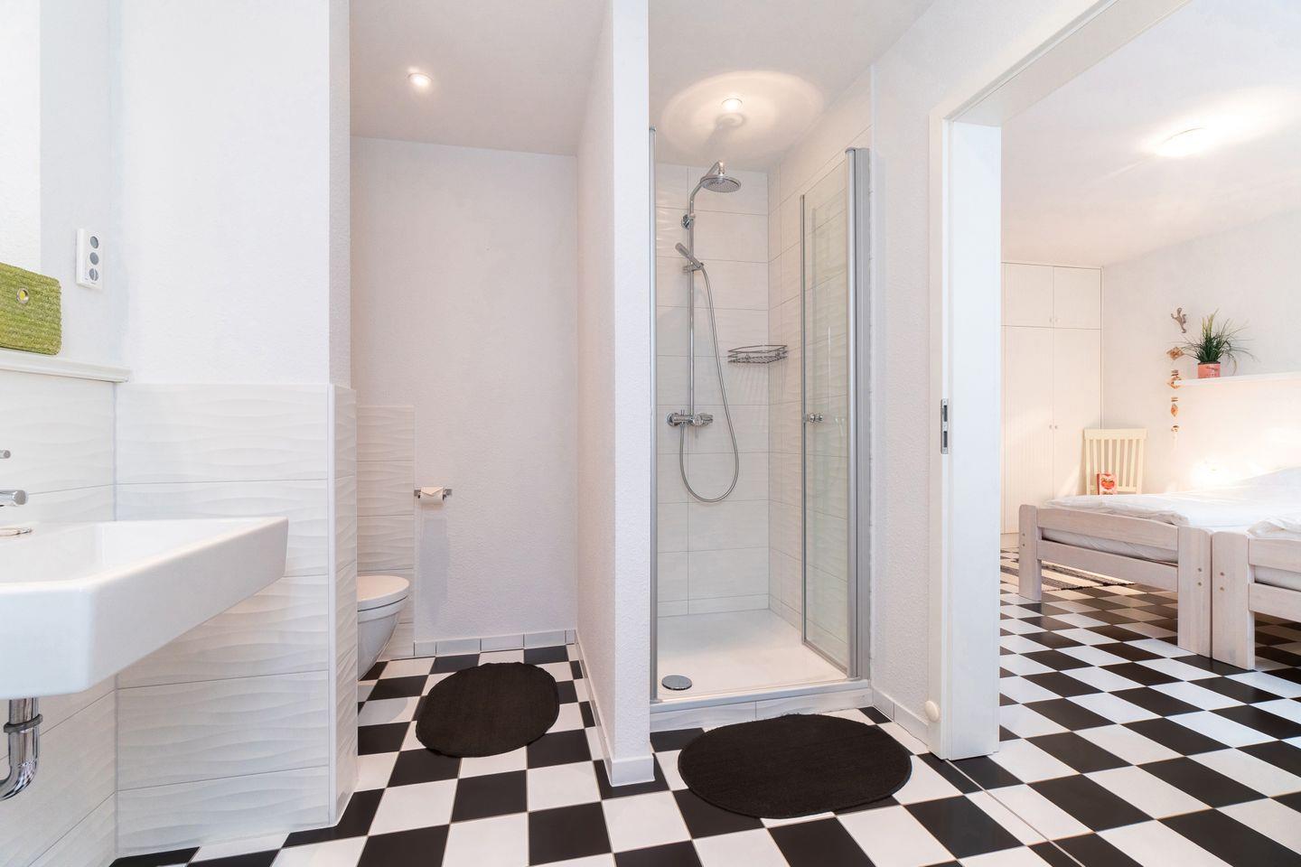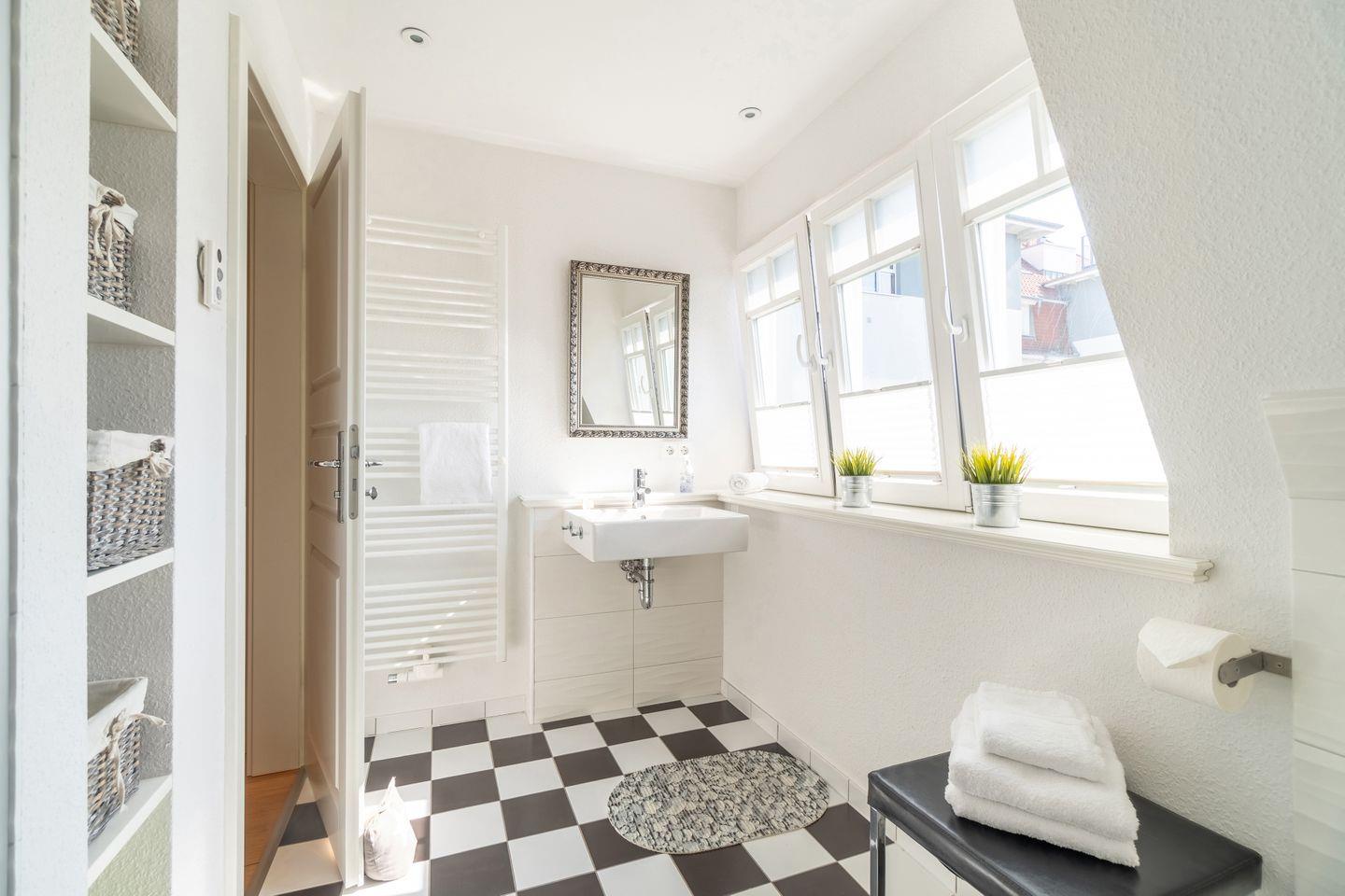 Im Obergeschoss sind die beiden Doppelbett-Schlafzimmer, zwei Duschbäder mit bodengleicher Dusche und die hauseigene Sauna gelegen. Eines der beiden Duschbäder ist en Suite