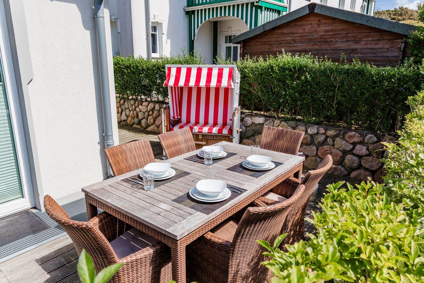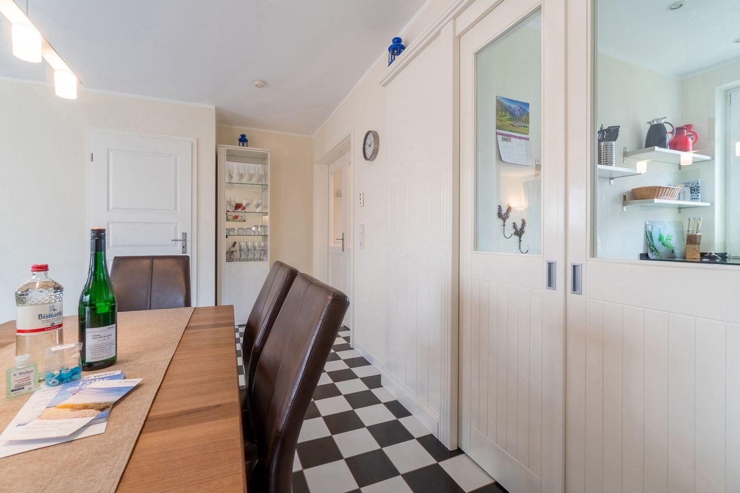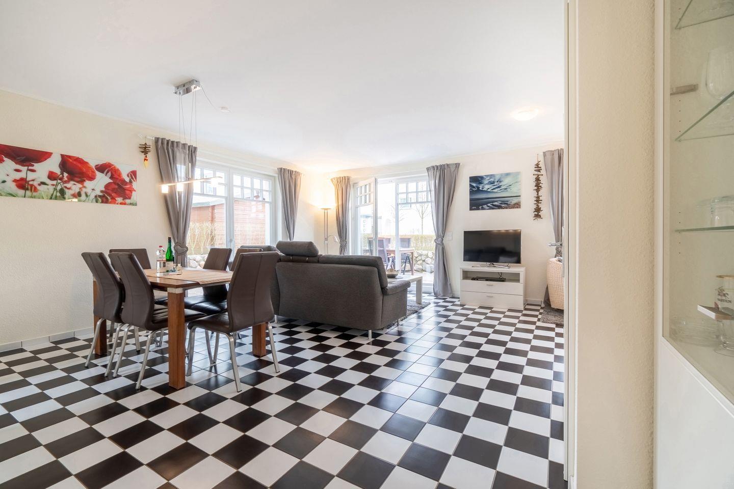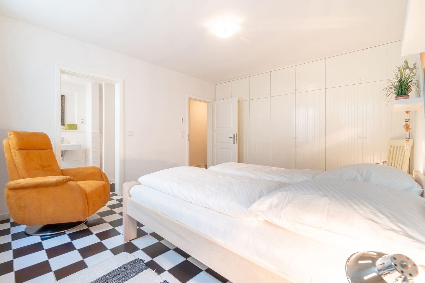 Im Erdgeschoss befinden sich das großzügige Wohn- und Esszimmer mit direktem Terrassenzugang und die Küche, die sich über eine Schiebetür vom Wohnbereich trennen lässt, sowie ein Gäste-WC. Zudem steht Ihnen ein Saisonstrandkorb direkt am Strand zur Verfügung, im Strandabschnitt 13-19.