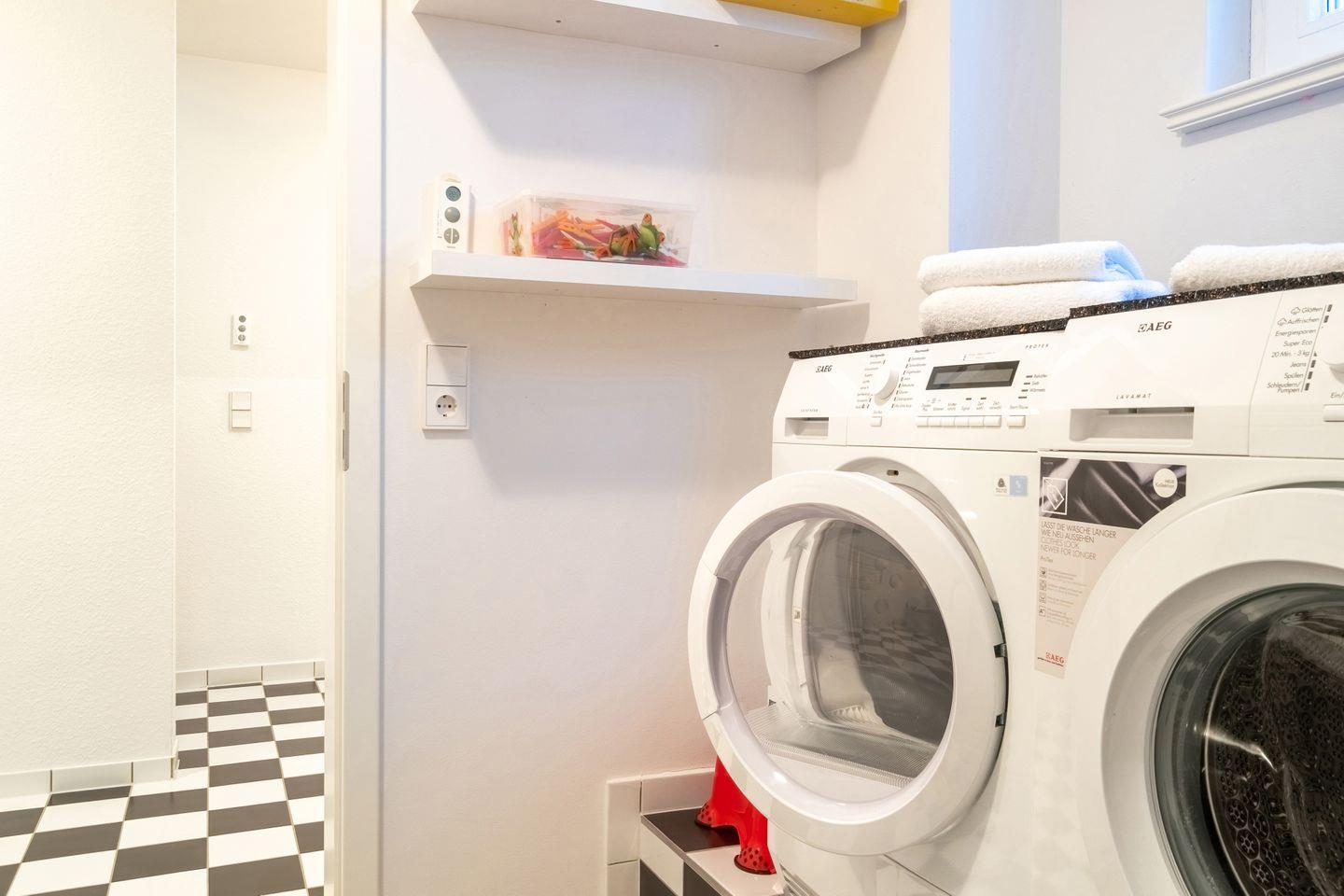 Im Souterrain befinden sich ein weiteres Schlafzimmer mit Doppelbett, ein Duschbad en Suite und ein Hauswirtschaftsraum mit Waschmaschine und Trockner.