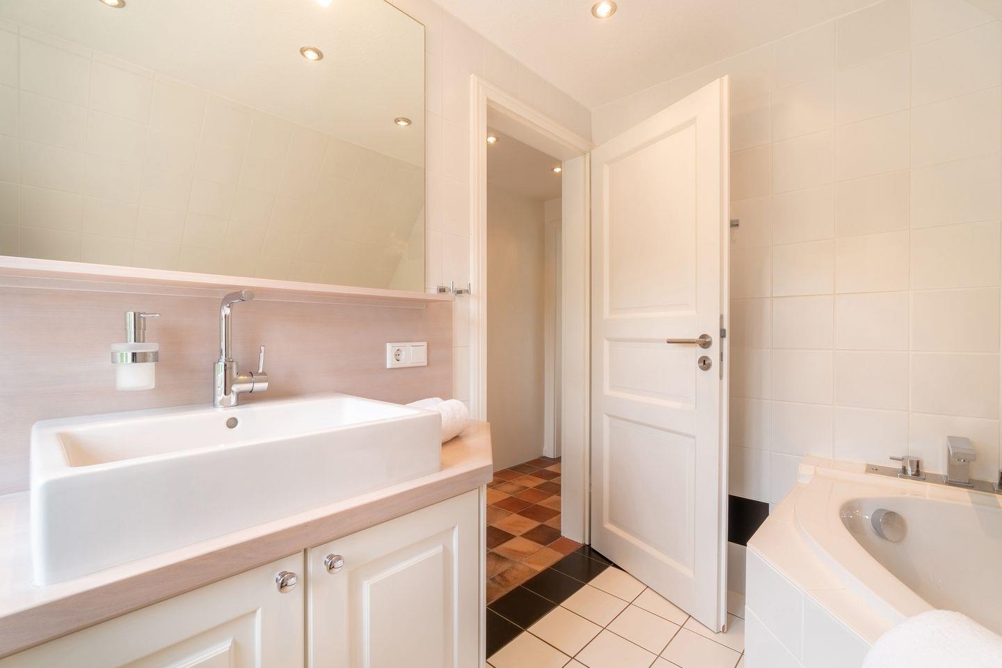 Das Obergeschoss verfügt über ein Doppelbett-Schlafzimmer mit eigenem Fernseher und Arbeitsbereich sowie ein Kinderzimmer mit Alkovenbett, welches über das Doppelbett-Zimmer zu erreichen ist. Zudem befindet sich im Obergeschoss ein weiteres Badezimmer, ausgestattet mit einer Badewanne.