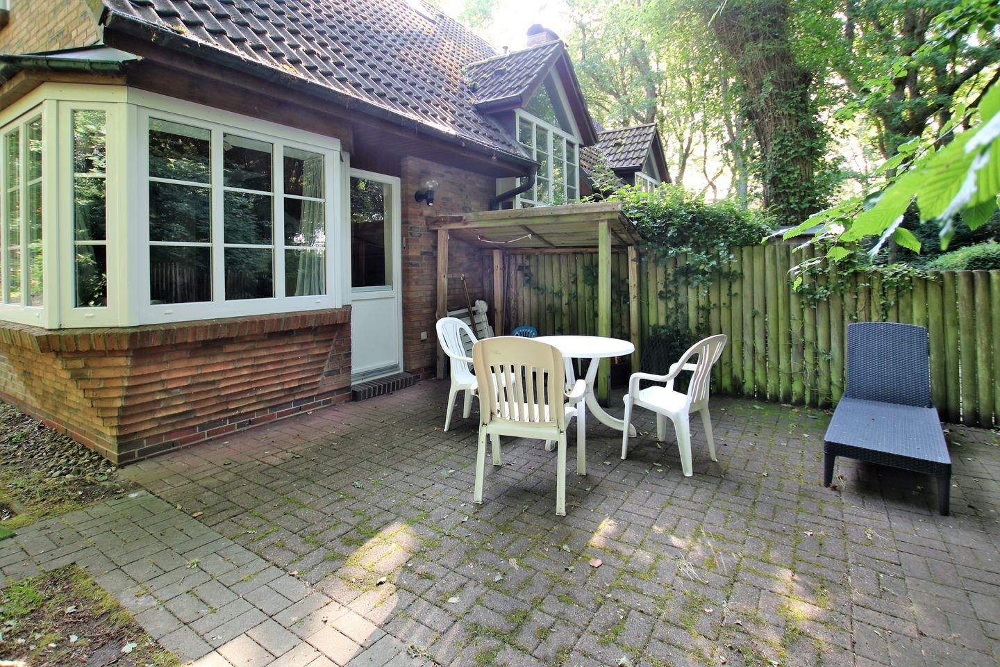 2-Zimmer Hausscheibe mit Südterrasse ( Liege, Stühle und Tisch) im Park (viele Laubbäume).