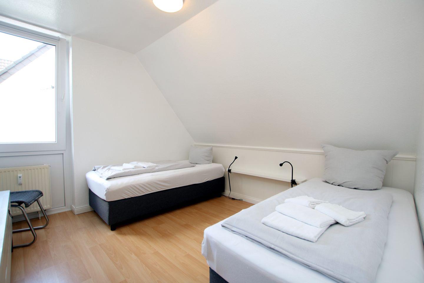 - Schlafzimmer mit zwei getrennt stehenden Betten und Kleiderschrank