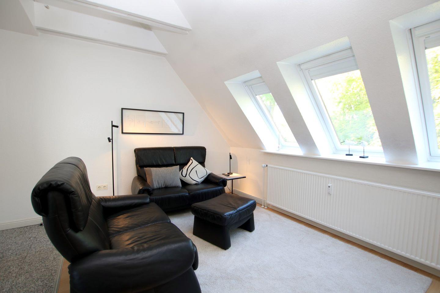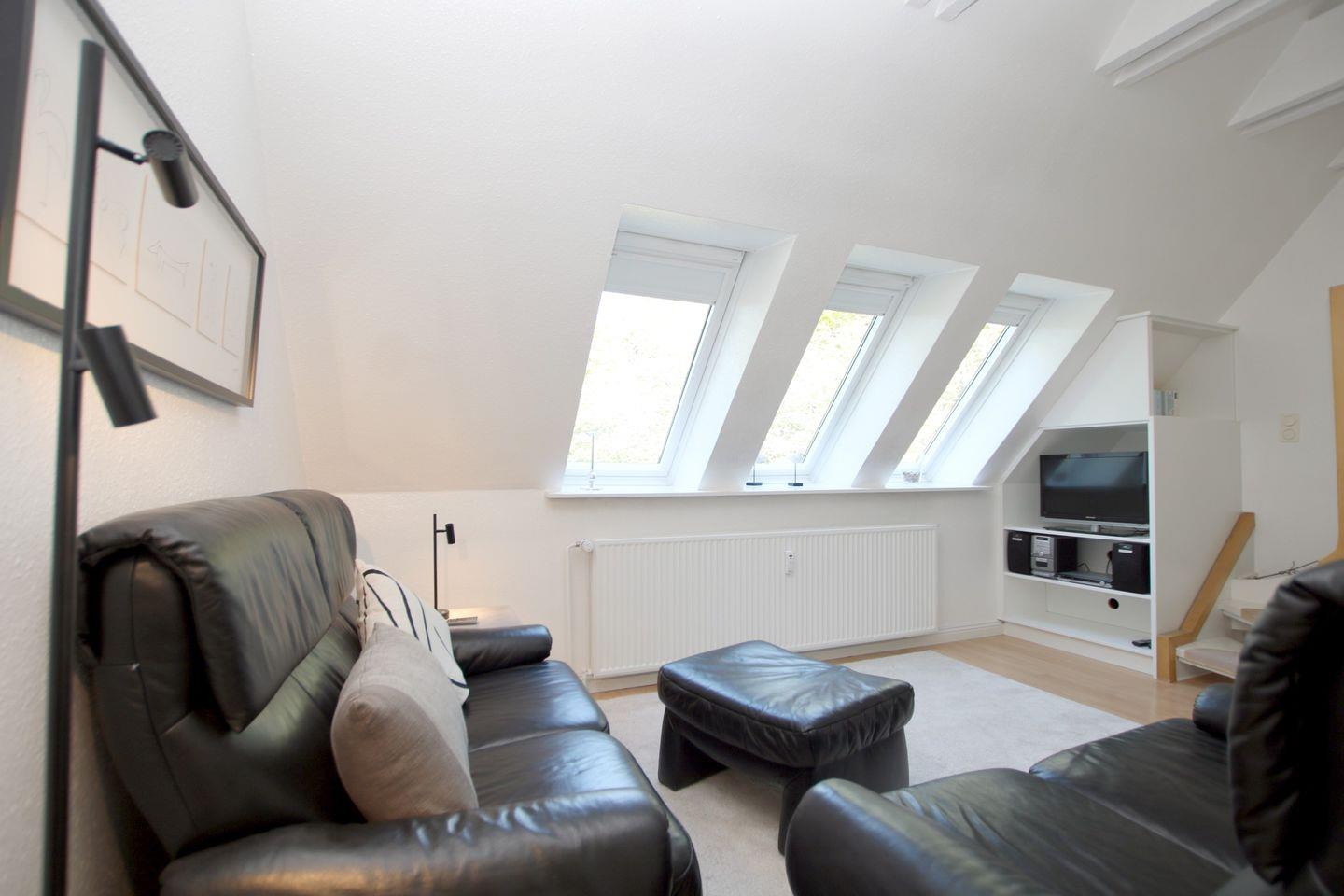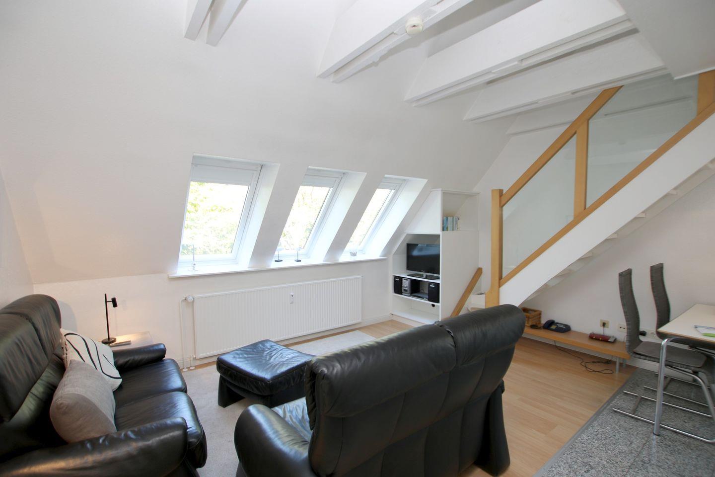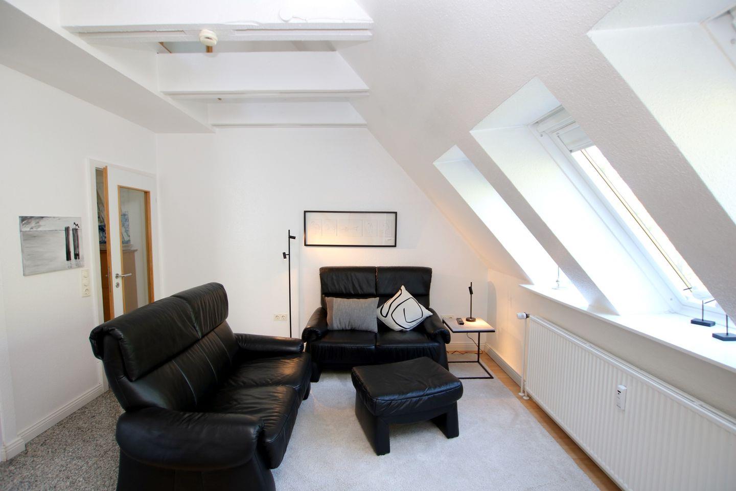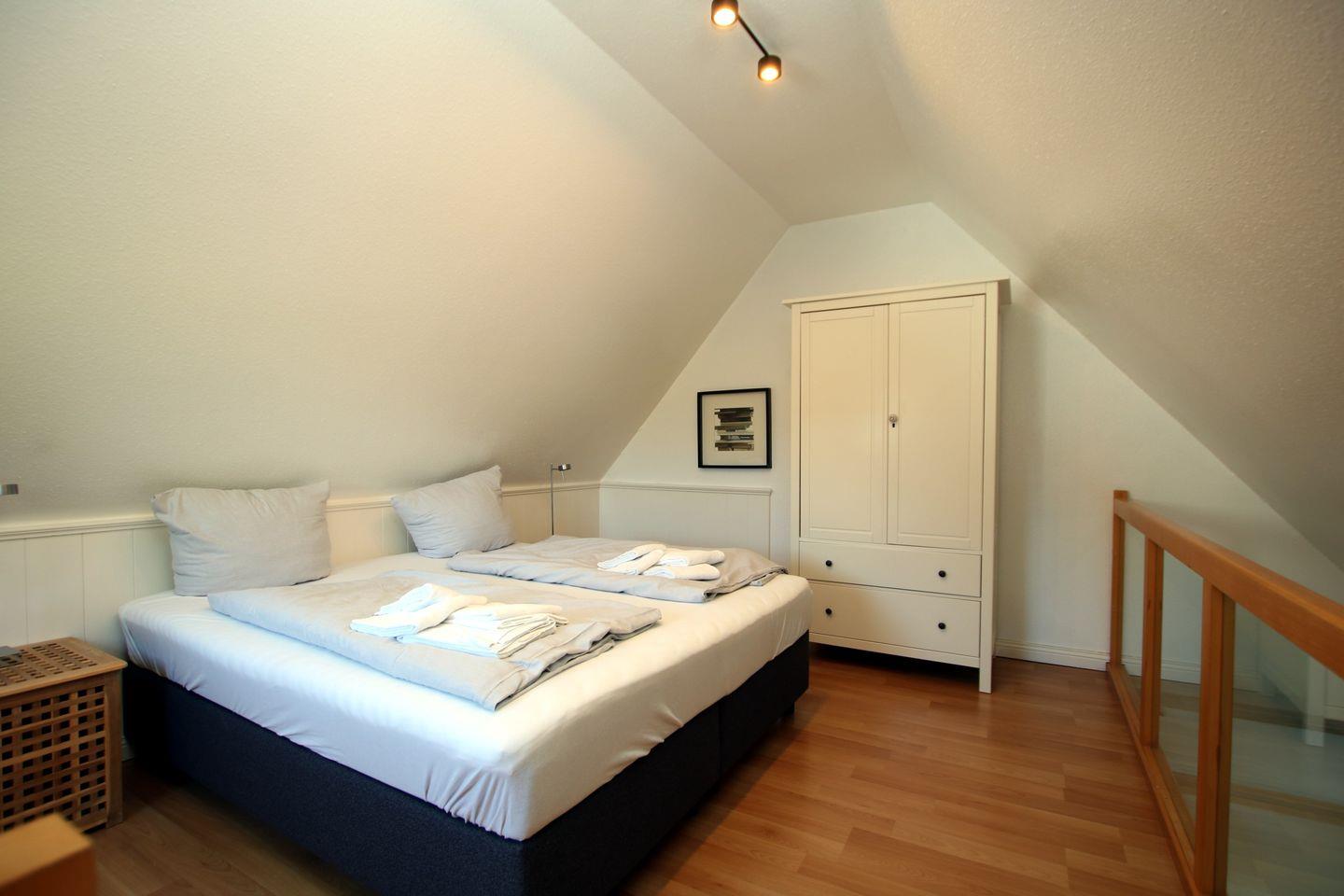 2-Zimmer-Nichtraucherwohnung in der 1. Etage mit kleinem Nordbalkon. WOHNZIMMER mit Sitzecke, Couchtisch, Essplatz und neue Küchenzeile. SCHLAFZIMMER mit zwei getrennt stehende Betten, Hochstuhl und Kleiderschrank. FLUR mit Garderobe. BAD mit Dusche, WC und Waschbecken. Vom Wohnzimmer aus führt eine Treppe zur offenen Galerie. Hier befindet sich ein Doppelbett. Parkplatz und Fahrradständer sind am Haus. Zum Strand sind es nur wenige Minuten zu Fuß. Einkaufsmöglichkeiten in der Nähe. Zum Wellenbad, Kurmittelhaus und Zentrum sind es ca. 30 - 45 Minuten Fußweg. Waschmaschine und Trockner auf Münzbasis stehen im Keller zur Verfügung.