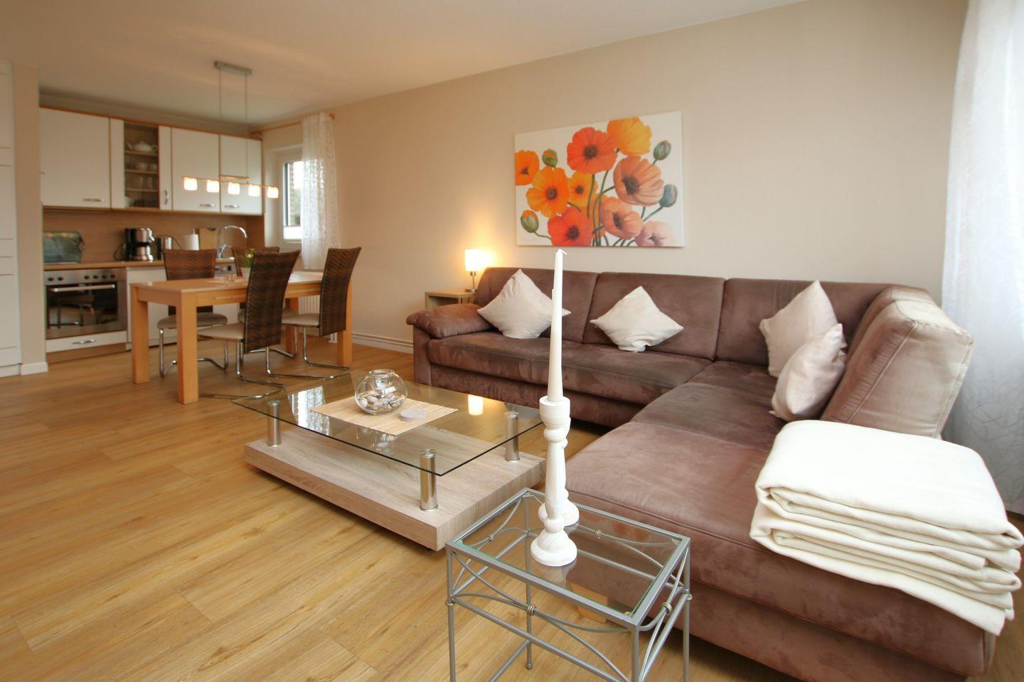 Ferienwohnung in Wyk auf Föhr, Museumstr. 16, Whg. Nr. 7 (ca. 45 qm), 2-Zimmer-Nichtraucherwohnung in der 1. Etage mit Südbalkon. WOHNZIMMER: Wohnbereich mit Ecksofa, Doppelschrankbett (1,60 x 2 m), Esstisch mit 4 Stühlen und Küchenzeile.