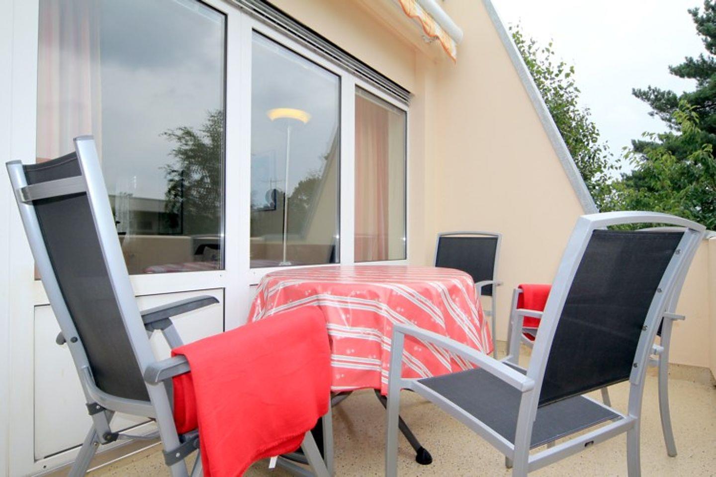 LAGE: Nähe Friesenmuseum . Zum Zentrum, Strand, Wellenbad und Kurmittelhaus sind es ca. 10 min Fußweg. Balkonstühle mit Tisch, Liege und Sonnenmarkise.