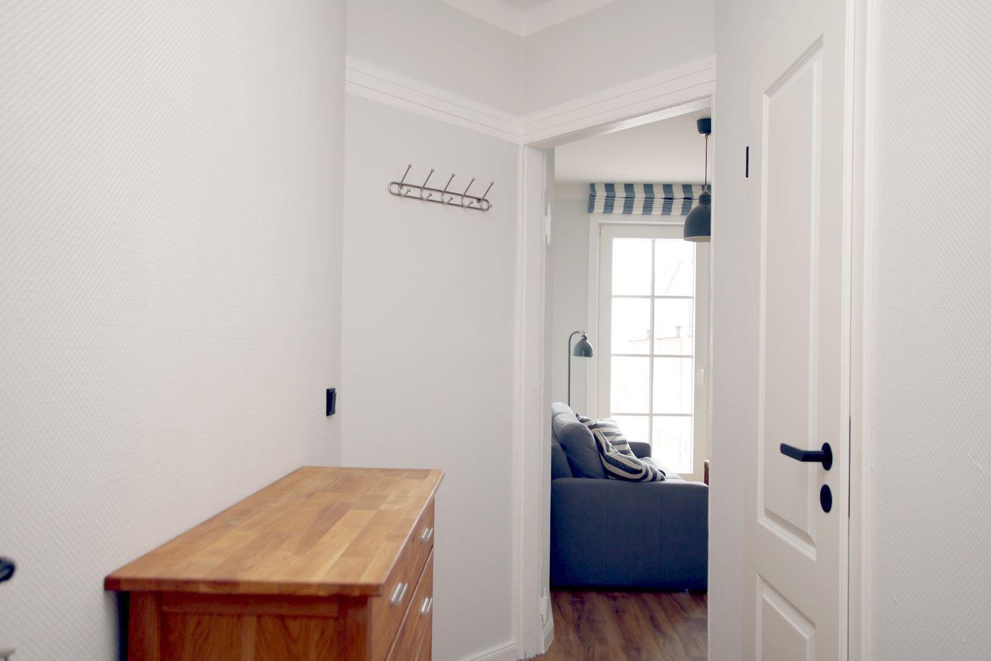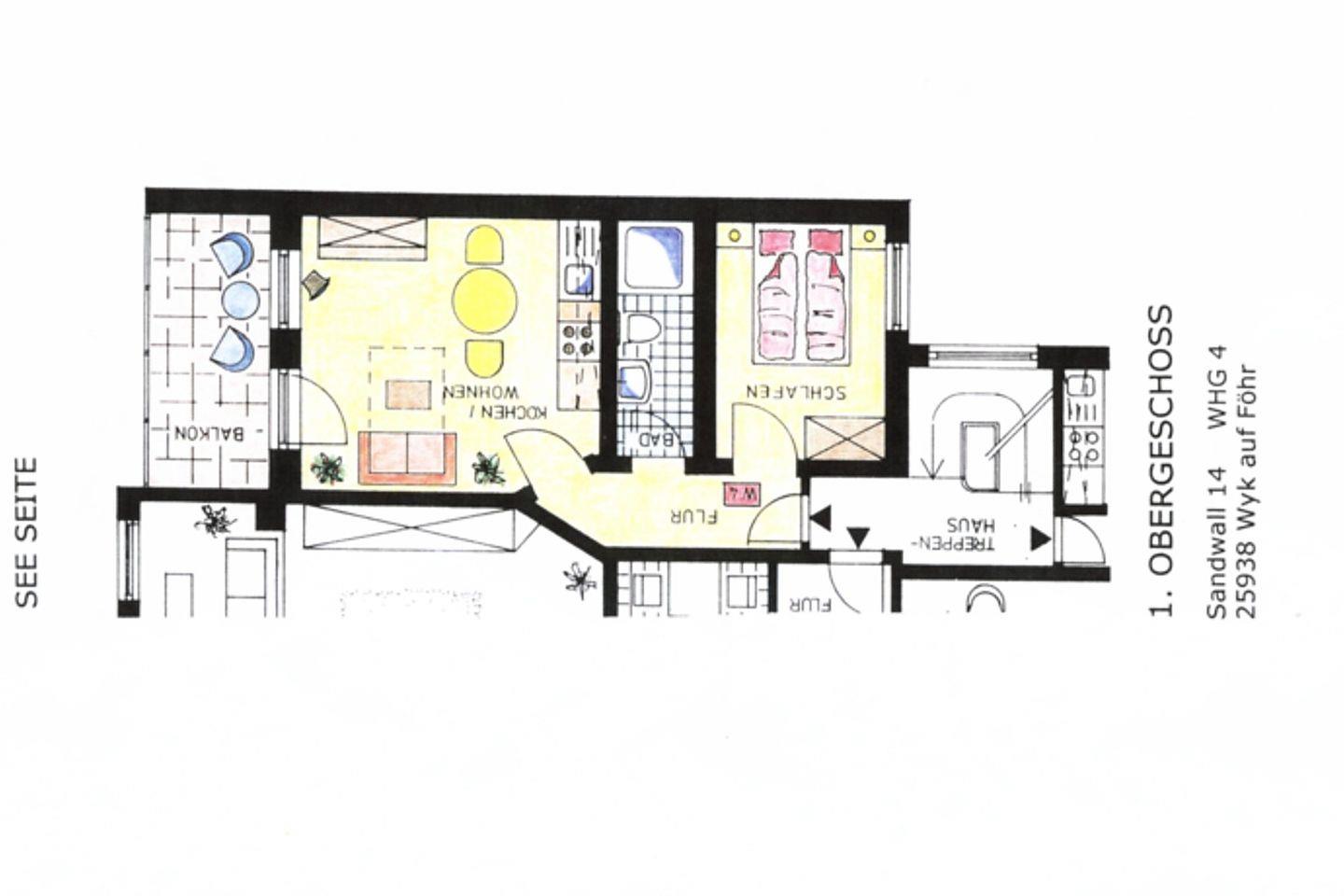Ferienwohnung in Wyk auf Föhr, Sandwall 14, Wohnung 4 (ca. 40qm) mit Meerblick. 2-Zimmer-Nichtraucherwohnung in der 1 Etage mit Ostbalkon und Meerblick. WOHNZIMMER: Doppelcouch, Kommode, Esstisch mit 3 Stühlen und KÜCHENZEILE. SCHLAFZIMMER: 2 Einzelbetten ( 0,90 X 2m) die zusammen stehen und ein Kleiderschrank. BAD mit Dusche/WC. Zentral aber doch ruhig in der Fußgängerzone. W-Lan steht zur Verfügung. Zum Strand sind es nur ein paar Meter. Wohnung ist mit Vinylboden ausgelegt und es sind keine Haustiere erlaubt. Kein Parkplatz an der Wohnung. Fahrräder können hinten im Hof abgestellt werden. Sehr gemütliche Wohnung mit Meerblick im Zentrum von Wyk.