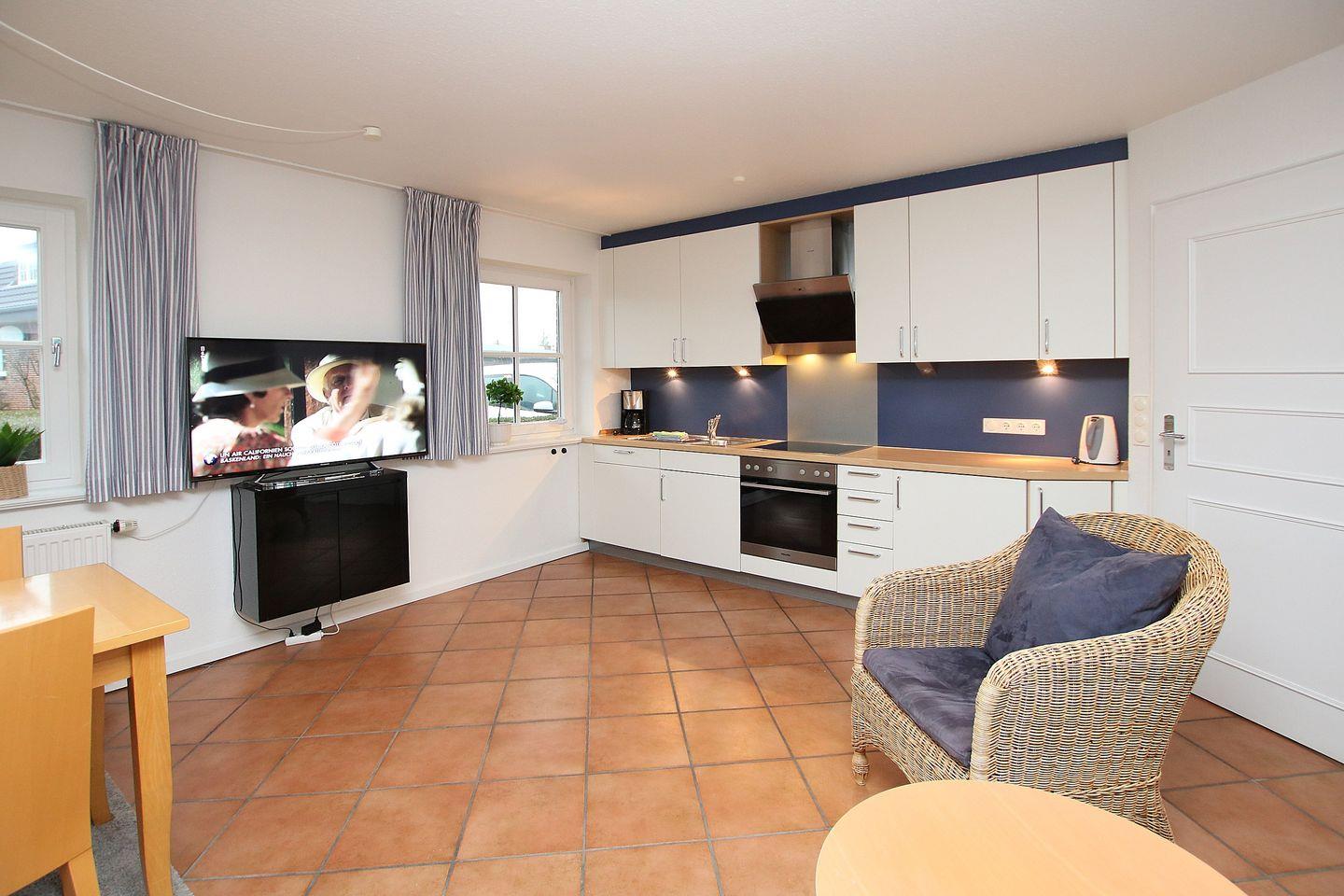 Die hellen 3-Zimmer-dieser Nichtraucher- Ferienwohnung verteilen sich auf ca.60 qm im Erdgeschoß mit toller Südwestterrasse und kleinem Gartenanteil. Das WOHNZIMMER ist ausgestattet mit einem gemütlichen Zweisitzer Sofa, zwei Sesseln und einem Couchtisch. Vom Wohnzimmer haben Sie einen direkten Zugang zur Terrasse mit Strandkorb (Saison von Mai - Mitte Oktober) und Gartenmöbeln.