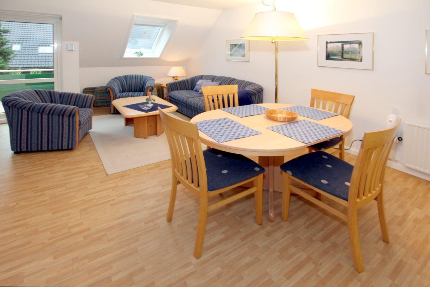 - Wohnzimmer mit Couch, 2 Sesseln, Esstisch mit 4 Stühlen, TV