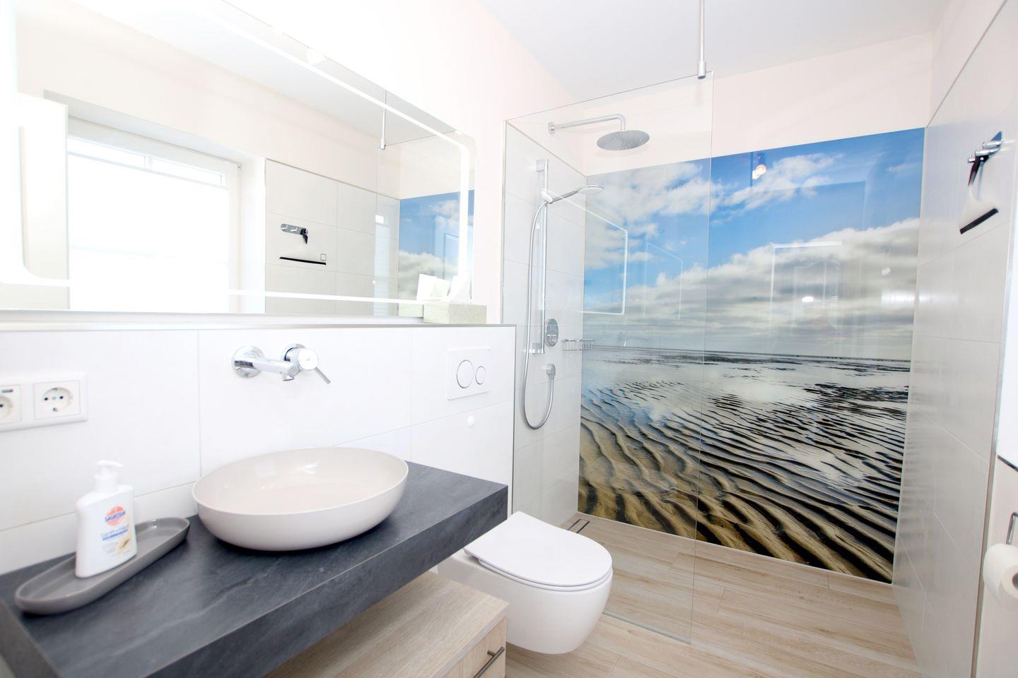 Bad: Ein großes Glaswandbild mit Meermotiv und eine fußbodenebene Dusche lassen jedes Duschen zu einem besonderen Vergnügen werden.