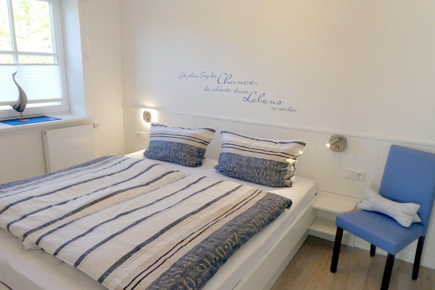 Schlafzimmer: 1 Doppelbett (1,80 m x 2,00 m), eingebauter Kleiderschrank, Stuhl, 2. Flatscreen