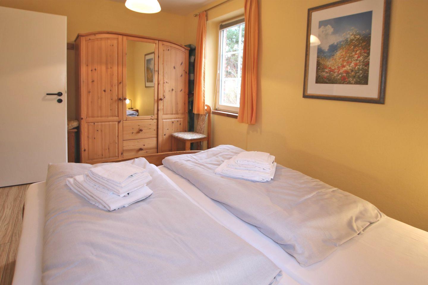 2-Zimmer-Nichtraucherwohnung im Erdgeschoß mit Südterrasse. WOHNZIMMER: Große Couch über Eck und 1 Sessel, Esstisch mit 4 Stühlen und KÜCHENZEILE mit Vollausstattung. SCHLAFZIMMER mit Doppelbett (1,60 x 2 m) und Kleiderschrank. BAD mit Dusche und WC. Fahrradständer und Parkplatz am Haus. Zum Strand sind es nur wenige Meter, zum Zentrum, Kurmittelhaus u. Wellenbad ca. 15 - 20 Minuten Fußweg. Die Wohnung ist liebevoll und gepflegt eingerichtet und verfügt über eine Fußbodenheizung (überall). Münzwaschmaschine und Trockner, Bügeleisen und -brett stehen im Keller zur Verfügung. Das Wohnzimmer ist mit Fliesen ausgelegt.