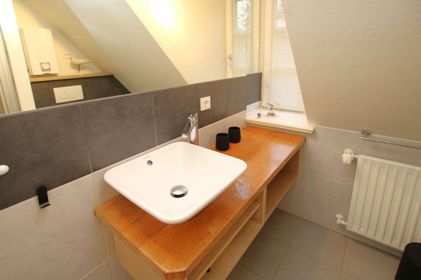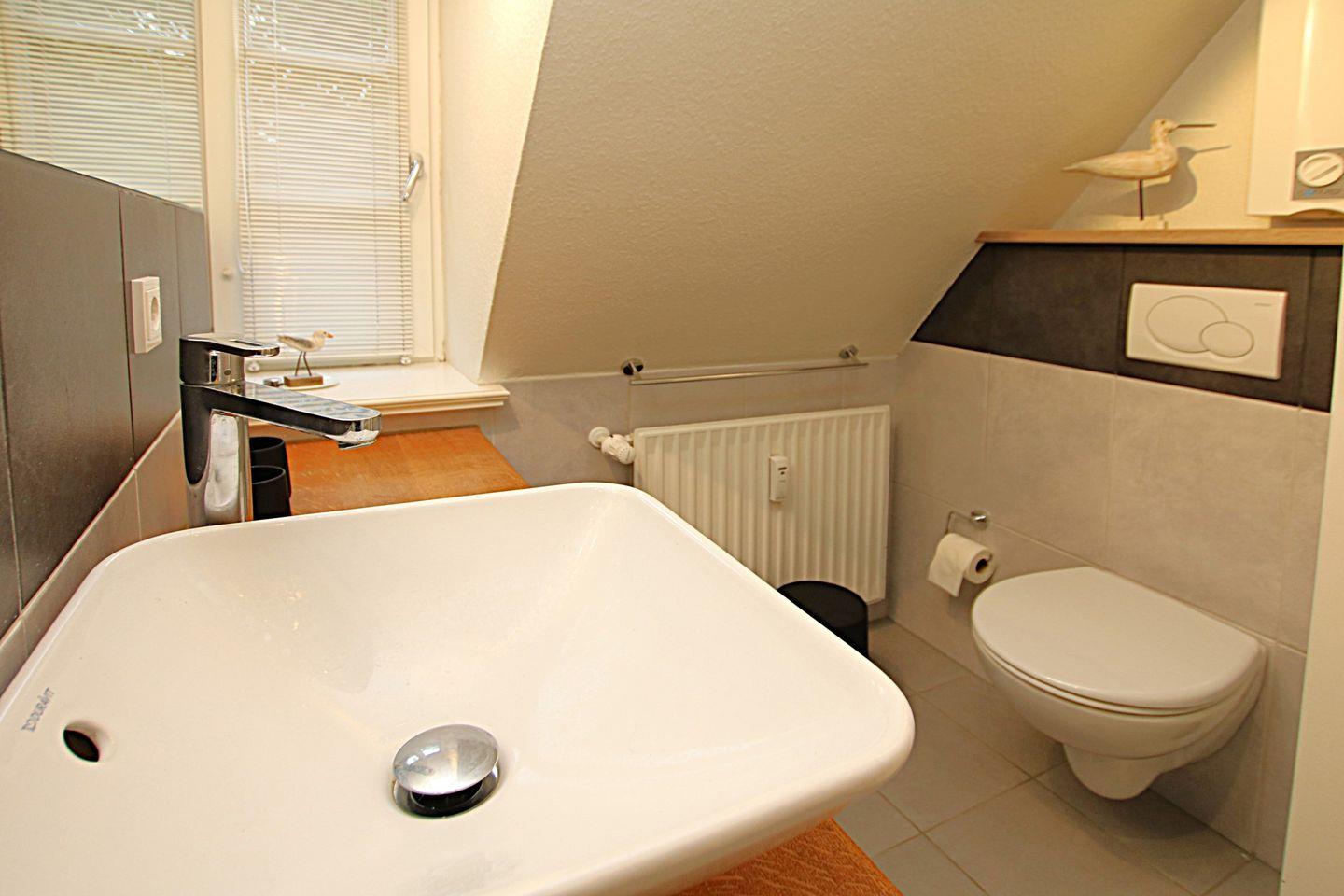 BAD: Dusche/WC. Vom Flur führt eine offene Treppe ins Dachgeschoss, dort stehen 2 Einzelbetten und ein Einbauschrank zur Verfügung.