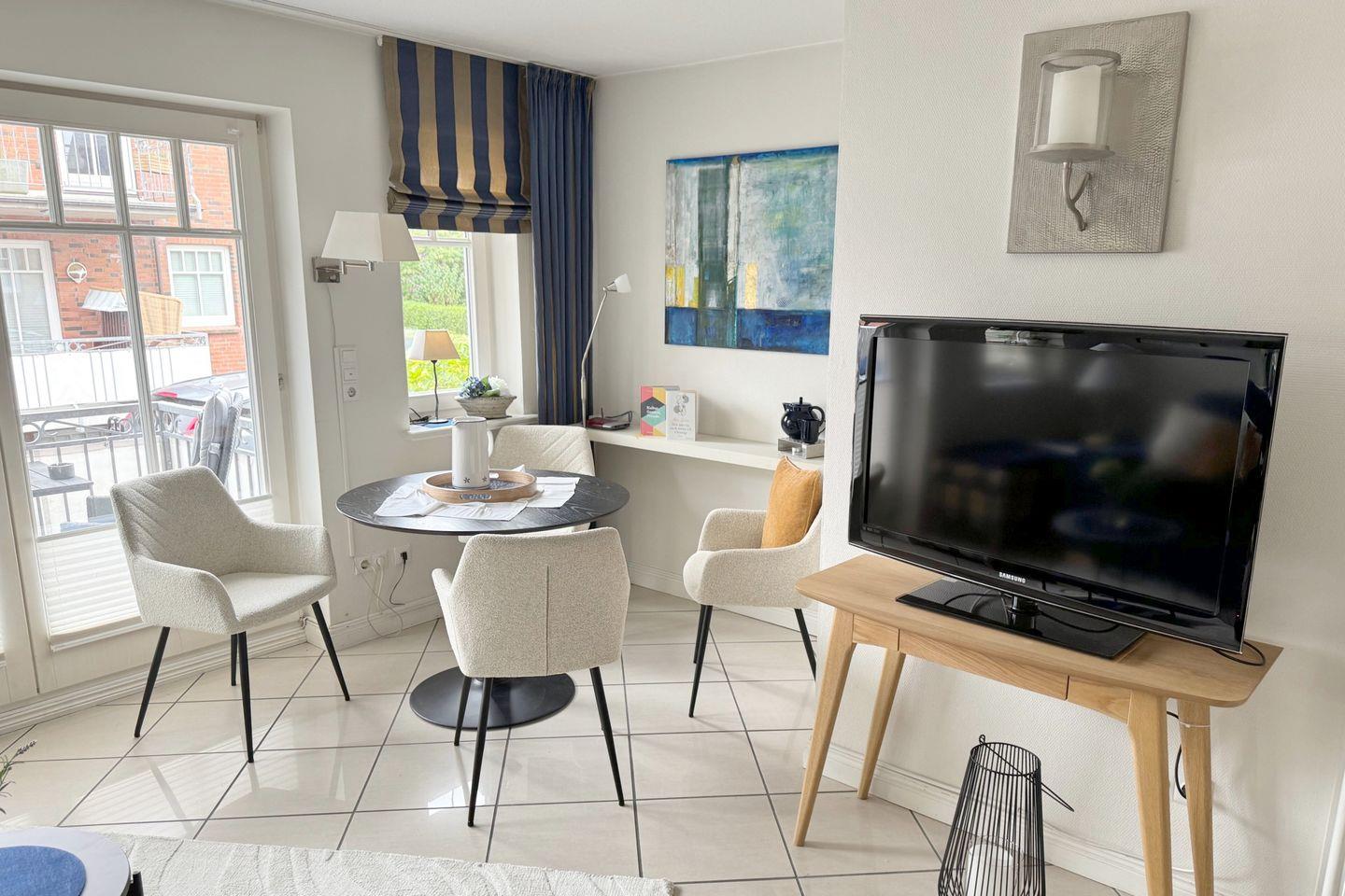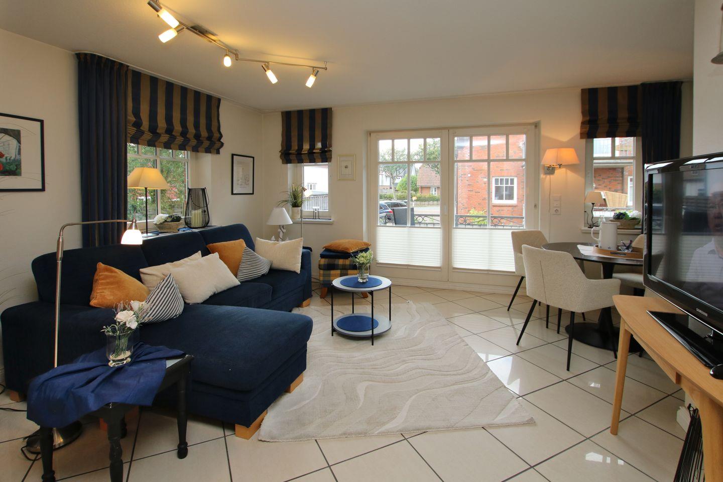 Ferienwohnung in Wyk auf Föhr, Rungholtstraße 6a, Wohnung Nr.2, 2-Zimmer-Nichtraucherwohnung (ca. 45 qm) im Hochparterre mit 1 Ostbalkon mit Strandkorb und 1 Südbalkon. WOHNZIMMER: Sitzecke mit 3er Eckcouch und 1 Sessel mit Hocker, Esstisch mit 4 Stühlen, KÜCHENZEILE. SCHLAFZIMMER: Doppelschlafcouch (1,40 x 2m), Kleiderschrank, TV. Wohnzimmer und Schlafzimmer mit Fliesen ausgelegt.