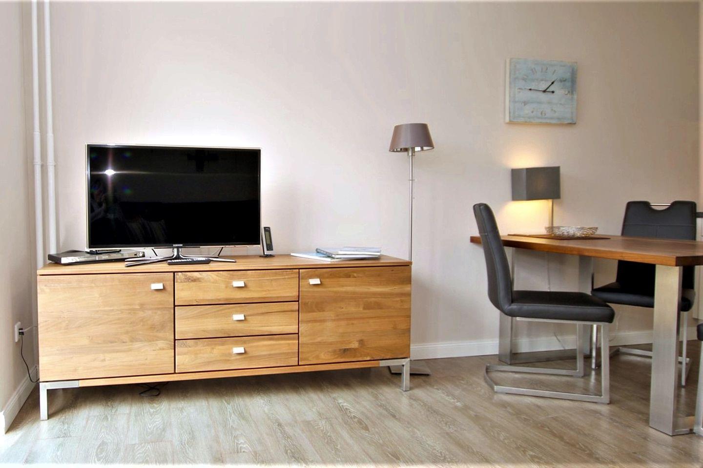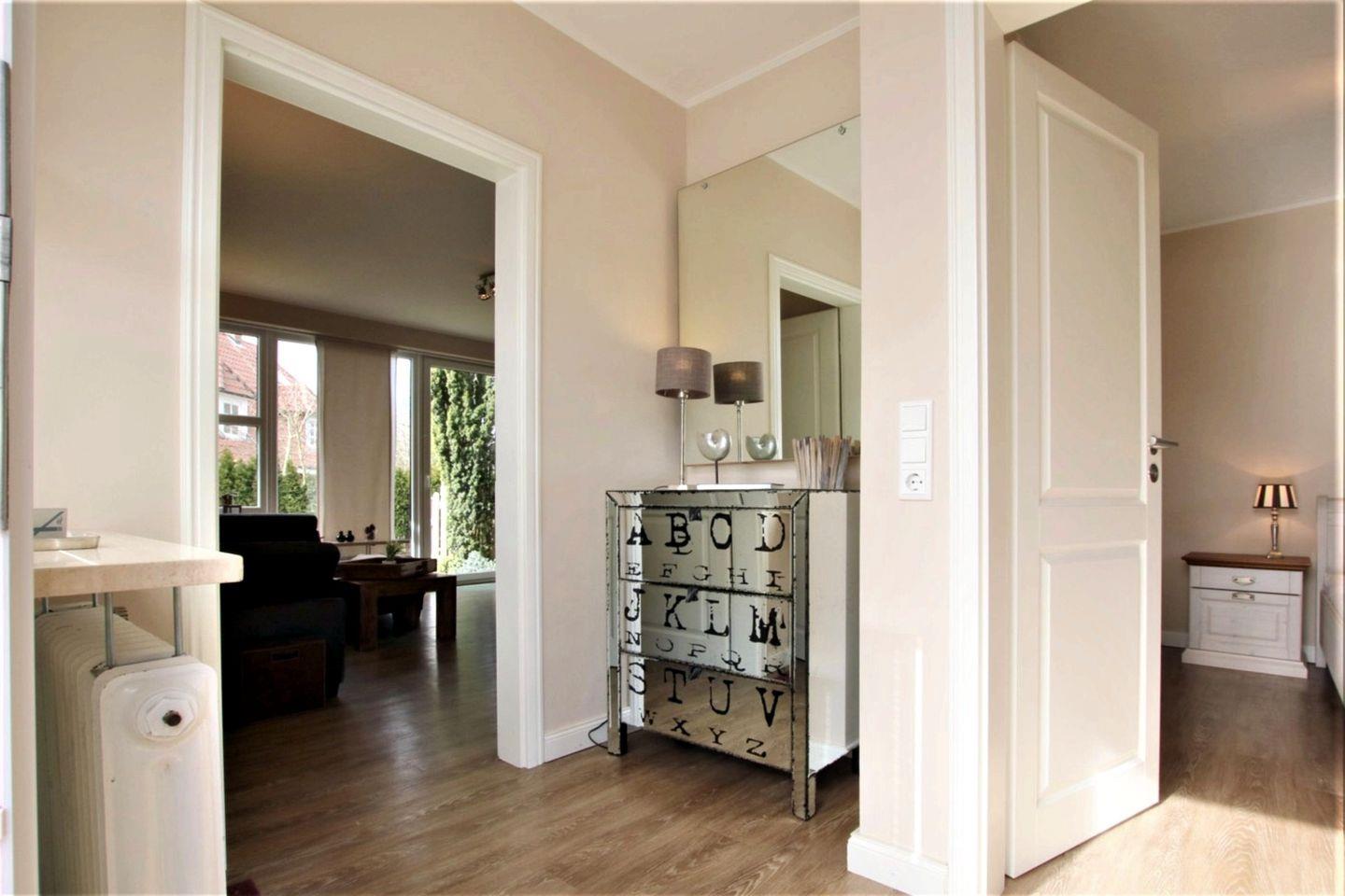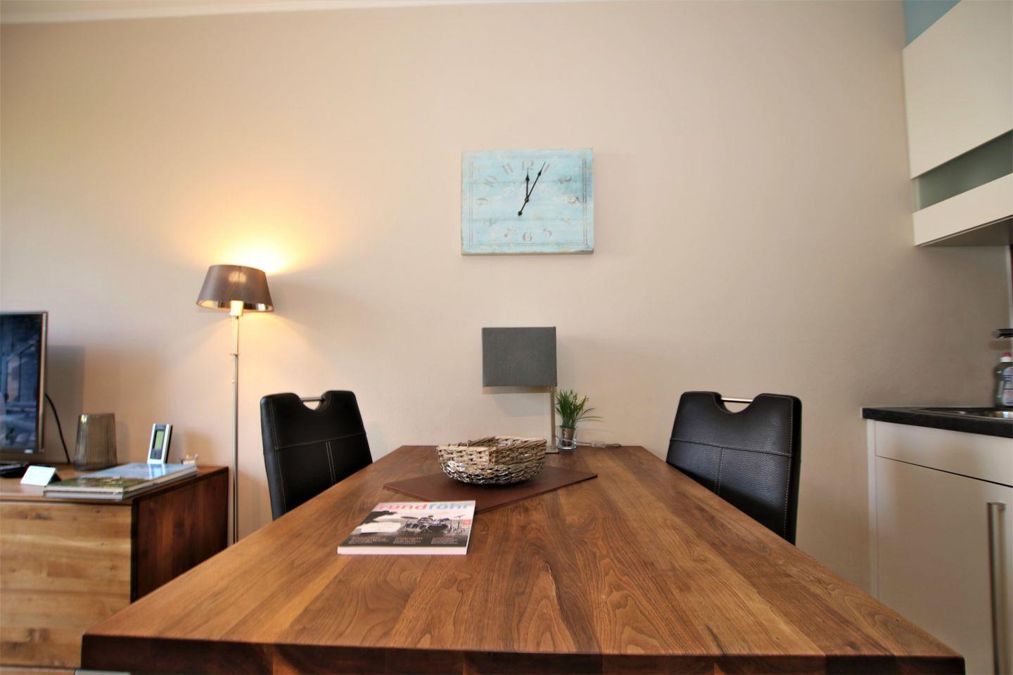 2-Zimmerwohnung im Erdgeschoß mit Westterrasse (Terrassenmöbel, Strandkorb), NICHTRAUCHER. WOHNZIMMER mit Ledercouch über Eck, LCD, Blue Ray Player, WLAN, Esstisch mit 4 Stühlen (Leder) und KÜCHENZEILE. BAD mit Dusche, WC und Waschbecken und eingebautem Radio. FLUR. SCHLAFZIMMER mit Doppelbett (200 x 200 cm) und Kleiderschrank und zweitem LCD/TV. Waschmaschine und Trockner auf Münzbasis im Keller. Fahrradständer am Haus.