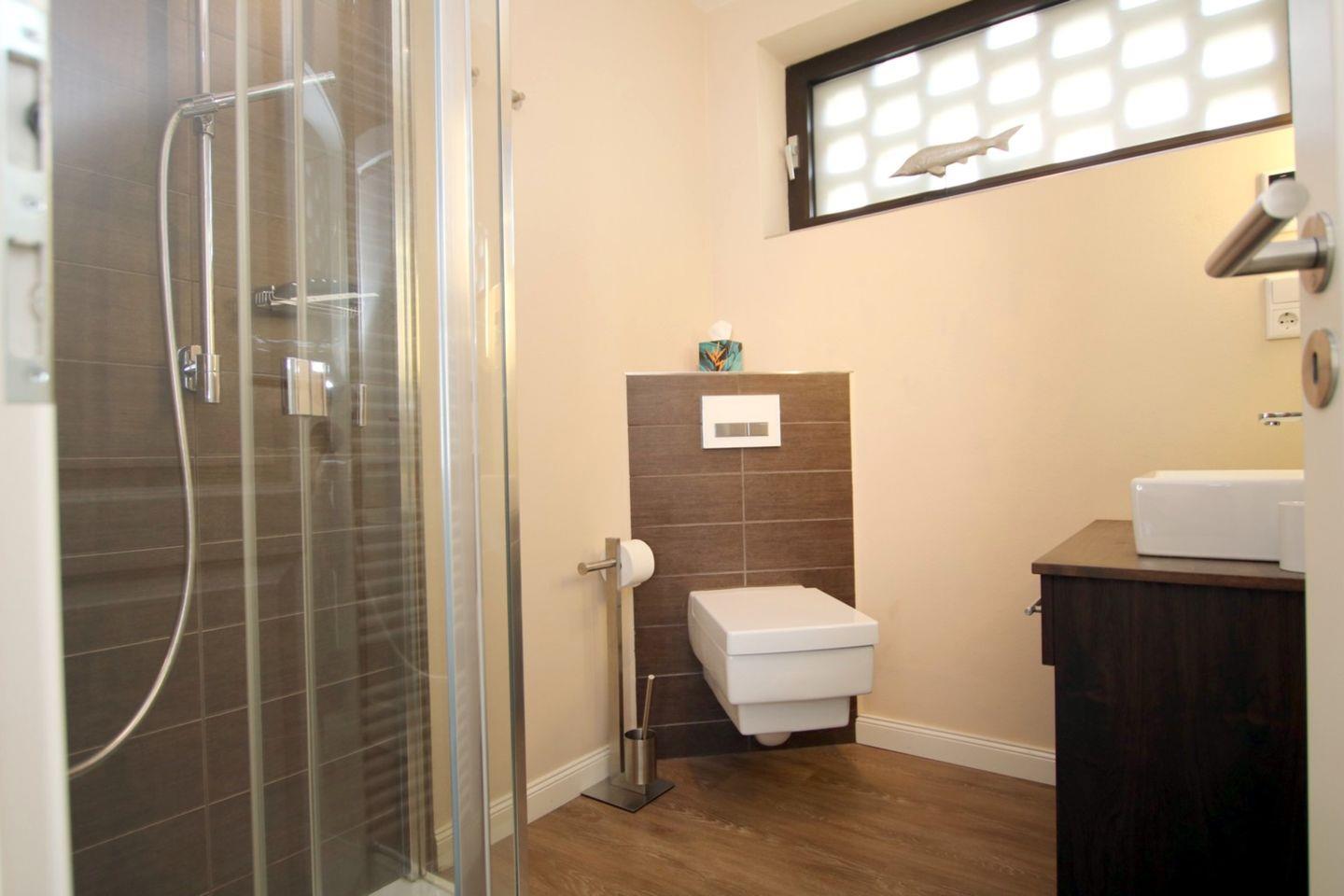 - Schickes Badezimmer mit Dusche und WC und Radio