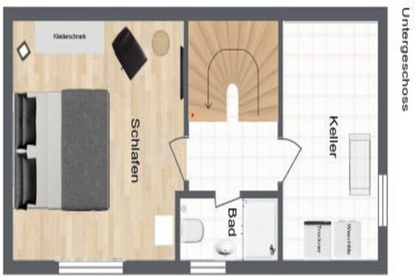 Offenes Treppenhaus, eingebautes Treppengitter vom EG aus ins Untergeschoss. Im Untergeschoss befindet sich das Strandzimmer, ein zweites Schlafzimmer mit 2 getrennt stehenden Betten, Kleiderschrank Kommode, Sessel und zweitem LCD TV, sowie ein zweites Badezimmer mit Dusche und WC sowie ein Hauswirtschaftsraum mit Waschmaschine und Wäschetrockner zur freien Nutzung, Bügeleisen und Bügelbrett.