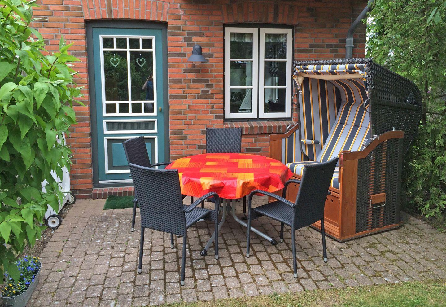 - Kleiner Garten mit Süd-Terrasse, Strandkorb, Gartenliege,Tisch mit 4 Stühlen