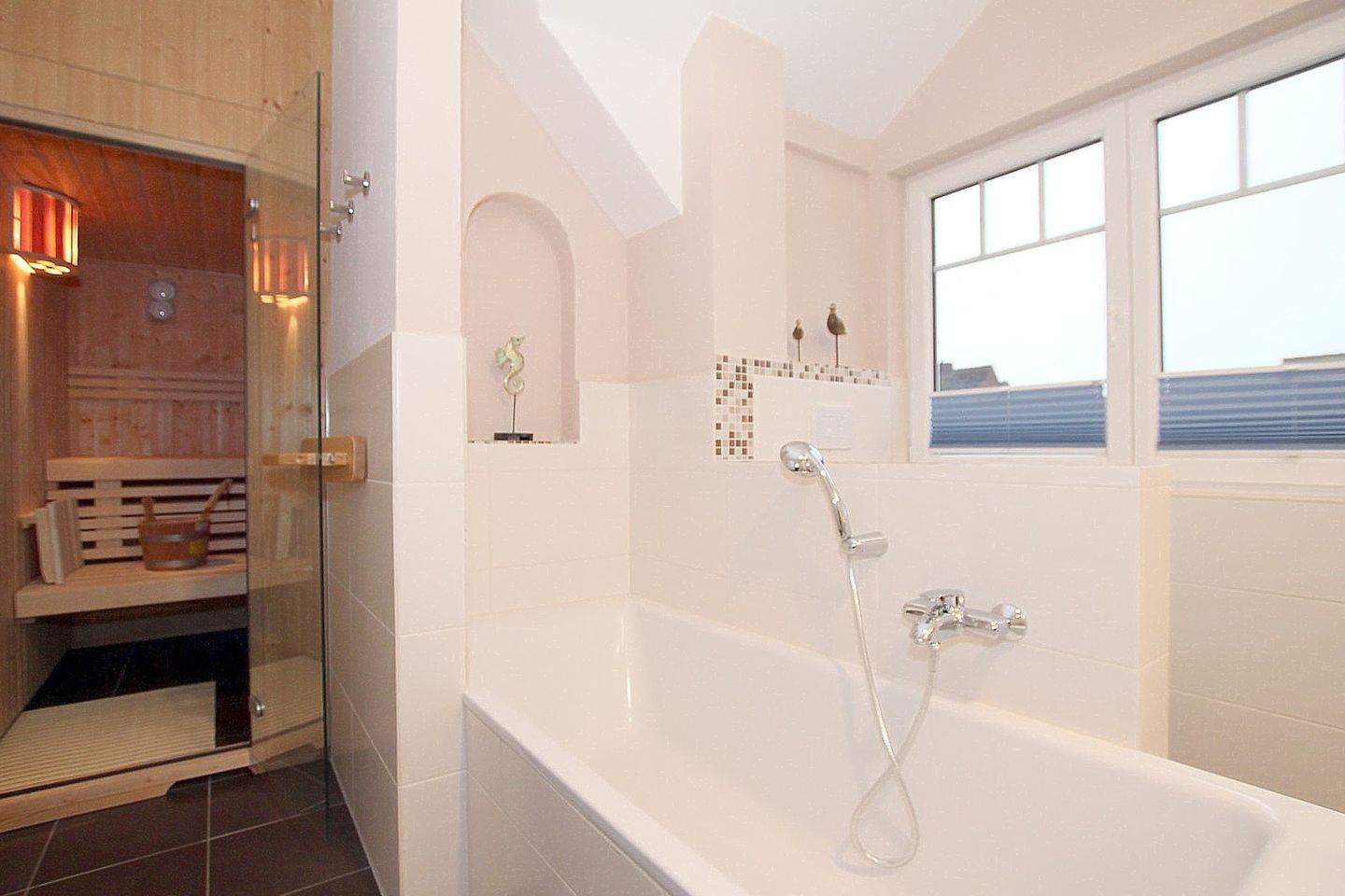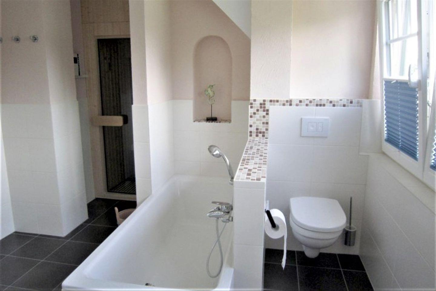 - Badezimmer 2 im OG mit Badewanne, Dusche, WC und Sauna