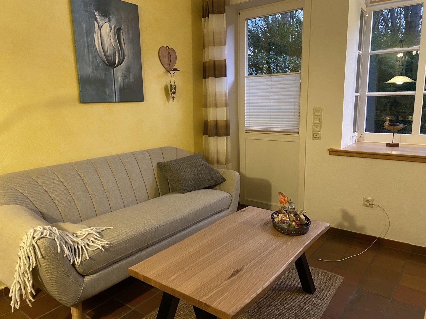 2-Zimmer-Hausscheibe mit Südterrasse und eigener Rasenfläche im Park (viele Laubbäume). WOHNZIMMER mit Küchenzeile, Esstisch mit 4 Stühlen und Couch.