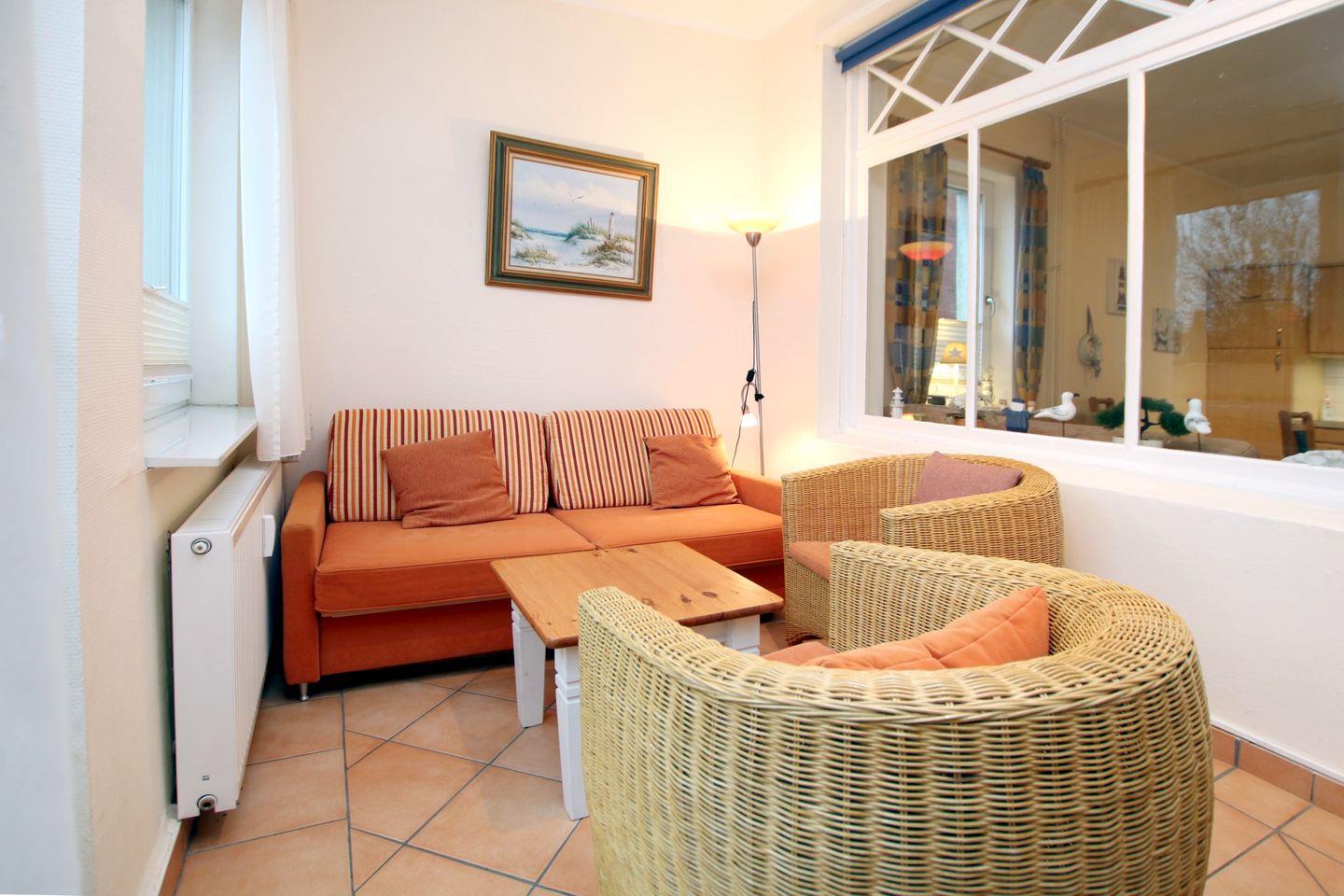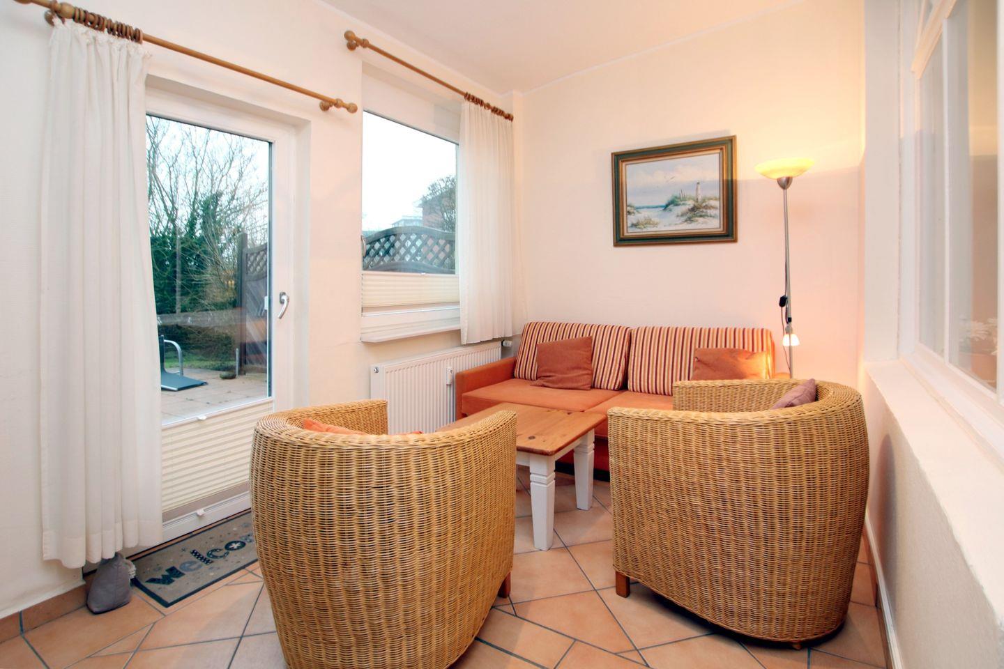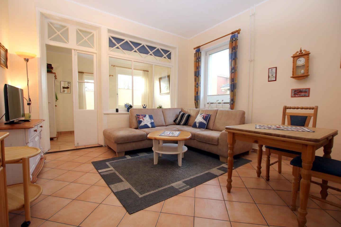 Ferienwohnung in WYK auf Föhr, Gmelinstraße 2, "Haus Heyden", Wohnung Nr. 3, ca. 64 qm, 2-Zimmer-Nichtraucherwohnung im Erdgeschoss mit Süd-Westterrasse und eigenem Parkplatz. WOHNZIMMER: Ledercouch und zwei Ledersessel, Esstisch mit 4 Stühlen und Anrichte. KÜCHENZEILE: Cerankochfeld, Kühlschrank mit Eisfach, Mikrowelle und Backofen. SCHLAFZIMMER: Doppelbett ( 200x200m) und Kleiderschrank. Im Erker ist ein Schlafsofa und eine gemütliche Sitzecke mit direktem Zugang zur Terrasse. BAD: Dusche und WC. Zum Zentrum, Kurmittelhaus und Aqua Wyk sind es ca. 15 - 20 Minuten Fußweg. Strand und Einkaufsmöglichkeiten in unmittelbarer Nähe ( Bäcker, Schlachter, Edeka-Markt).