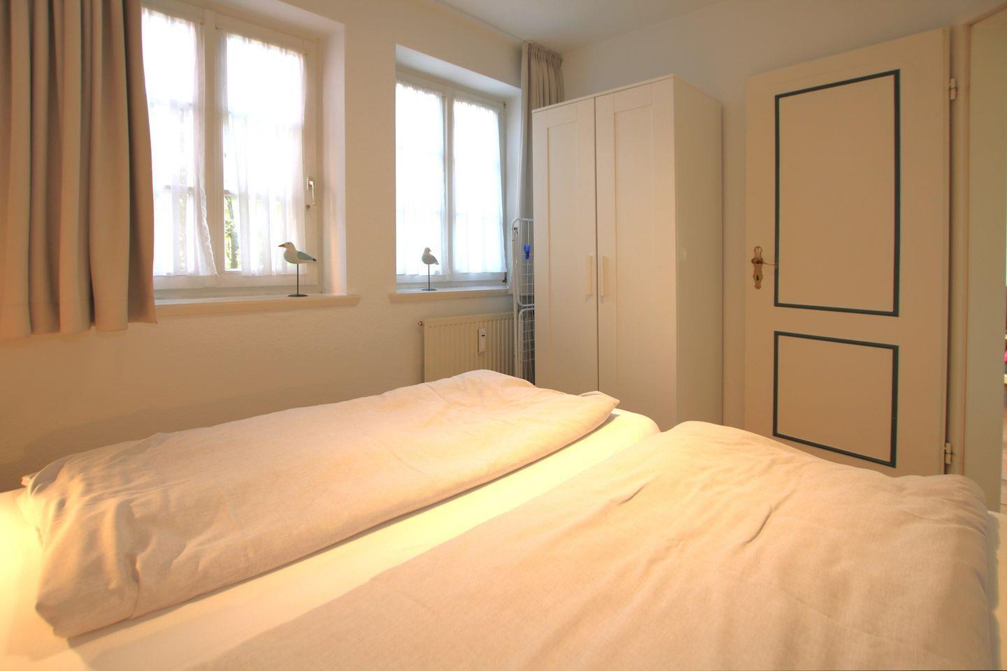 Doppelbett (1,60 x 2m) mit Kleiderschrank. SCHLAFZIMMER 2 mit Etagenbett (0,90 x 2m), Kleiderschrank und Klapptisch. BAD mit Dusche und WC. TERRASSE: mit Strandkorb. Im KELLER stehen allen Gästen SCHWIMMBAD und SAUNA zur Verfügung. Fahrradständer am Haus. LAGE: Marschnähe und dörflich. Bushaltestelle im Dorf. Zum Zentrum von Wyk, Strand, Kurmittelhaus und Wellenbad sind es ca. 20 - 30 Minuten Fußweg. Münzwaschmaschine und