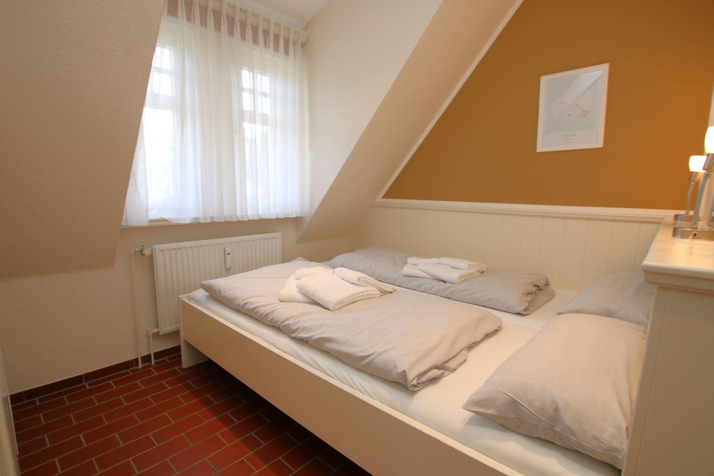 Das Schlafzimmer ist mit einem Doppelbett (160cm x 200cm) und einem Kleiderschrank ausgestattet. Vom Flur aus erreichen Sie das Badezimmer. Dieses ist mit einer Dusche, einer Handtuchhalterheizung sowie einem WC ausgestattet. Außerdem ist ein moderner Fön vorhanden. Ebenfalls vom Flur geht es über eine Treppe in das Dachgeschoß. Hier befindet sich die Finnische Sauna.