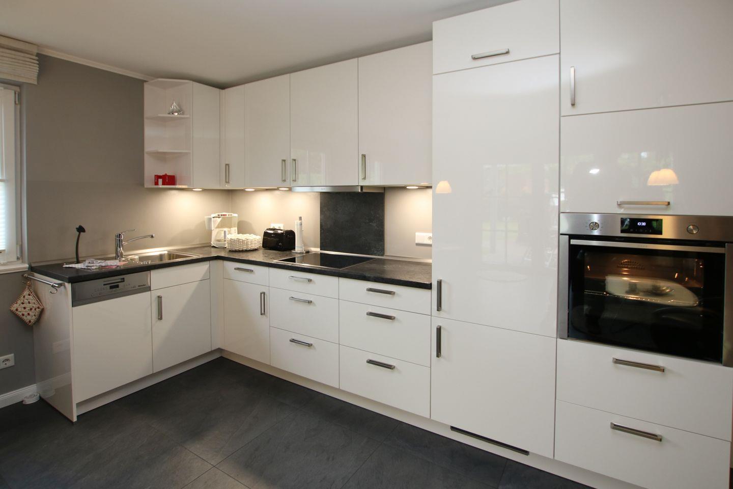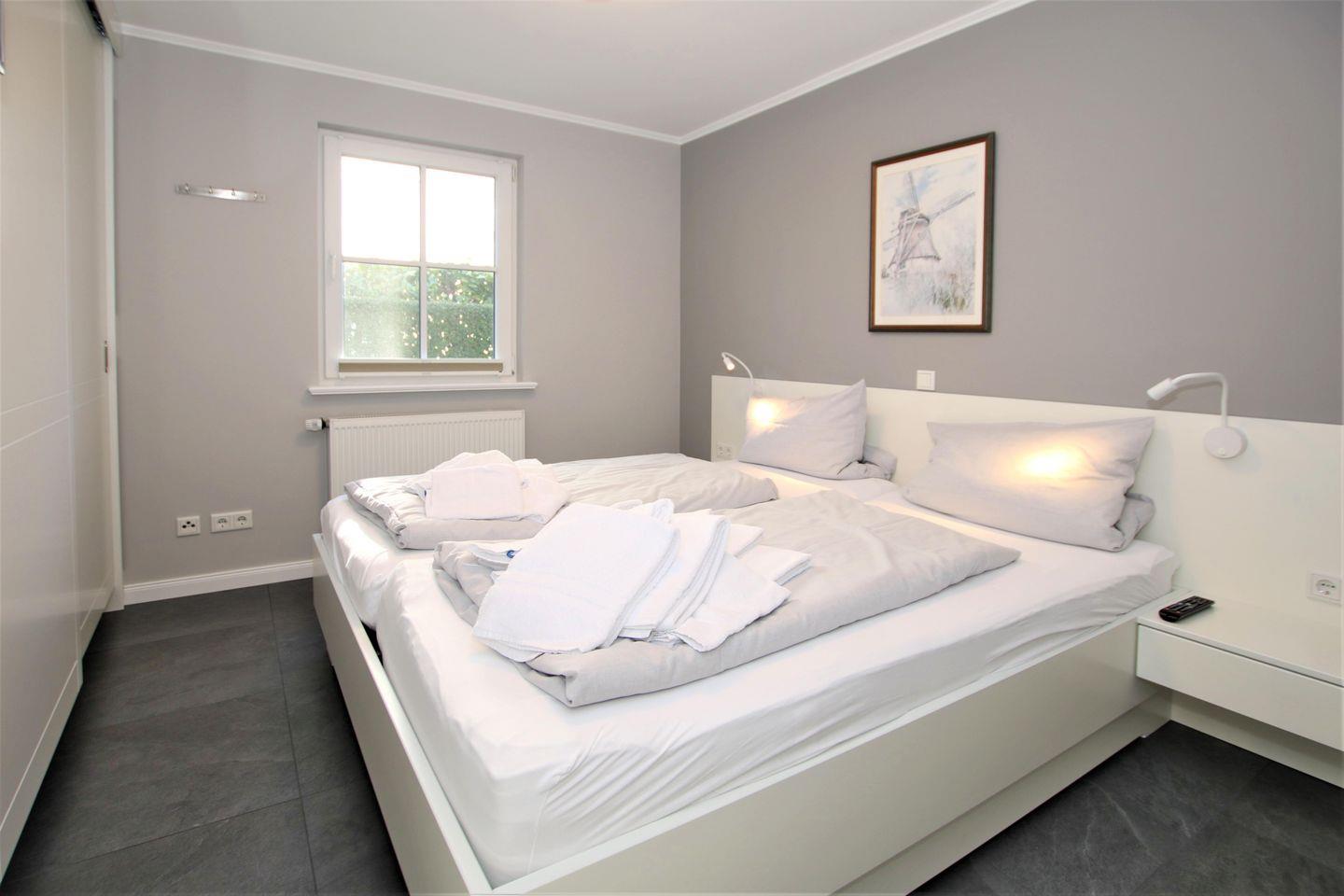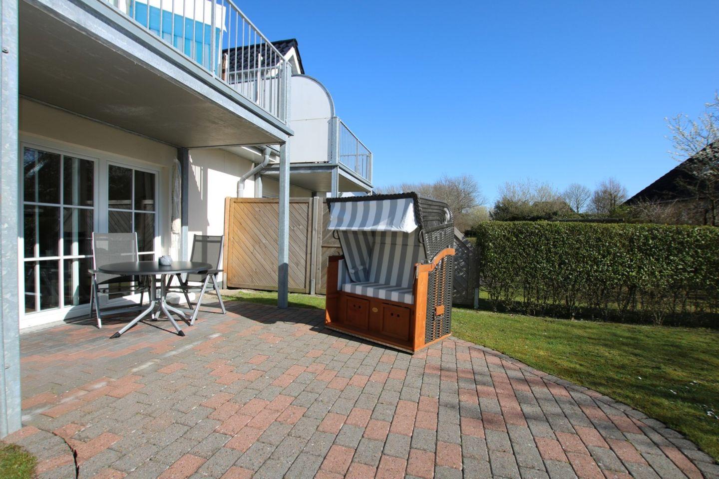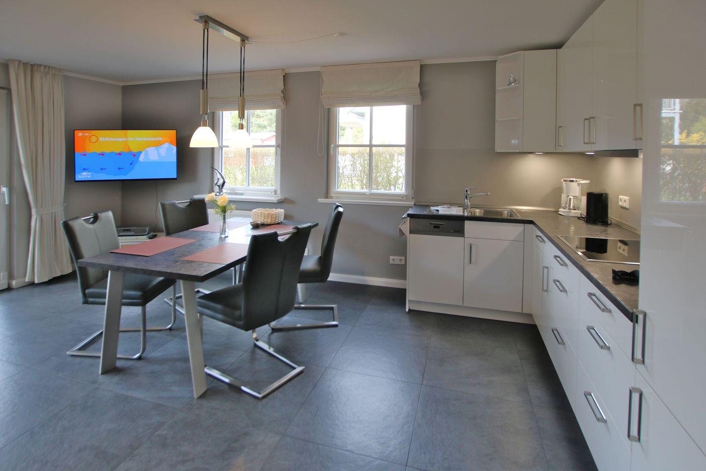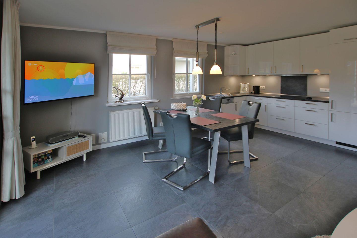 Zur Wohnung gehört außerdem ein toller eigener Garten, in dem die Kinder spielen können, die Eltern im Strandkorb entspannen und alle gemeinsam auf der Südterrasse essen können. Der großzügige Wohnbereich erwartet Sie mit einer gemütlichen Ledercouch und TV- Gerät. Auch die offene Küche mit einem Esstisch ist hier untergebracht. Außerdem haben Sie von hier aus direkten Zugang zum Garten bzw. zur Terrasse. Die Wohnung verfügt über zwei Schlafzimmer. Schlafzimmer 1 ist mit Doppelbett (1,80x2m), Kleiderschrank und TV-Gerät ausgestattet, das Schlafzimmer 2 mit 2 Einzelbetten, Kleiderschrank und TV- Gerät. Beide haben je ein Fenster und Tageslicht. Das Badezimmer verfügt über Dusche und WC, auch hier gibt es ein Fenster. Hier gibt es wie im Wohnzimmer eine Fußbodenheizung. Selbstverständlich verfügt die Wohnung über kostenfreies WLAN. Im Flur im Einbauschrank befindet sich ein Miele Wasch-Trockner.