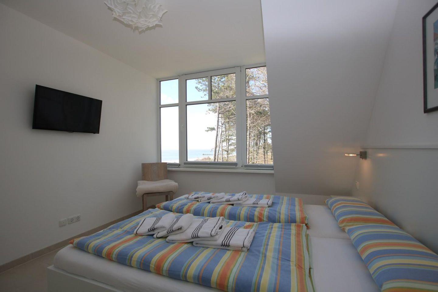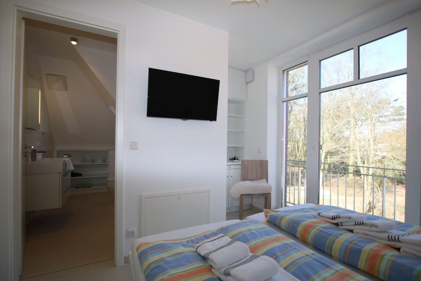 Das Schlafzimmer 1 mit Doppelbett, TV- Gerät und Kleiderschrank hat Meerblick, das Schlafzimmer 2 mit Doppelbett, TV- Gerät, Kleiderschrank, bodentiefen Fenstern und Bad en Suite mit Dusche und WC.