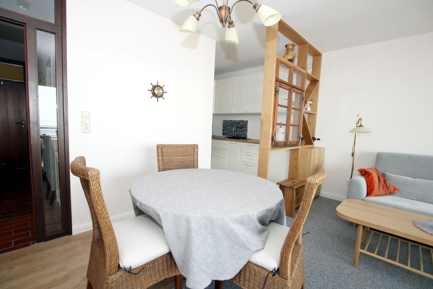 - Wohnzimmer mit Couch, Sessel, Esstisch mit 4 Stühlen und Küchenzeile