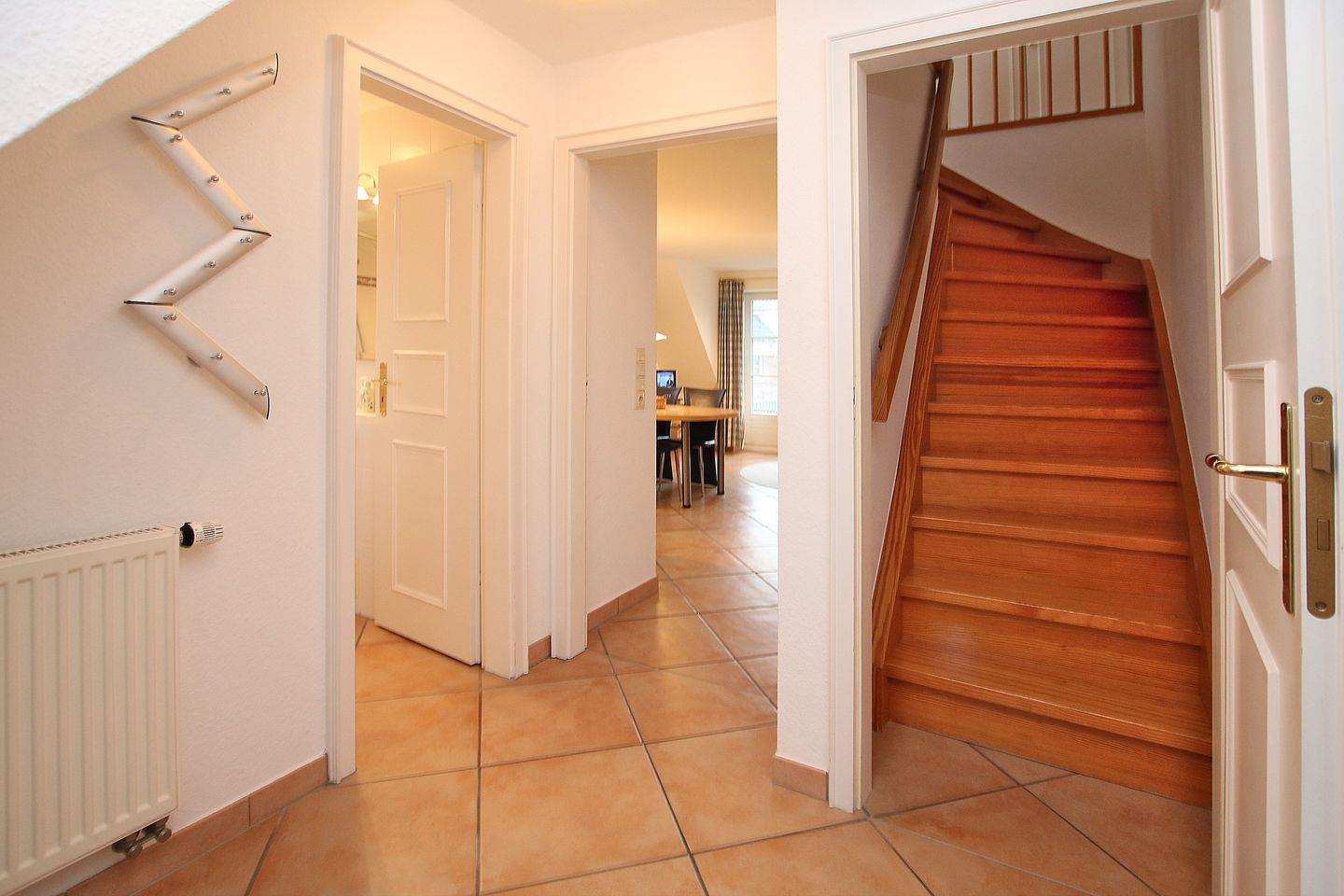 viel Komfort, Esstisch und 4 Stühlen. FLUR mit Garderobe. Diese Räume sind alle mit Fliesen ausgelegt. SCHLAFZIMMER im Spitzboden mit Doppelbett (2m x 2m) und Einbaukommode. Das Schlafzimmer hat Teppich. BAD mit Wanne/Duschvorhang und WC. Zum Zentrum sind es nur wenige Gehminuten, zum Hauptstrand ca. 300 m, zum Kurmittelhaus und Erlebnisbad ca. 700 m. LAGE: direkt im Zentrum, aber trotzdem sehr ruhig in zweiter Reihe. Waschmaschine und Trockner auf Münzbasis im Gemeinschaftskeller.